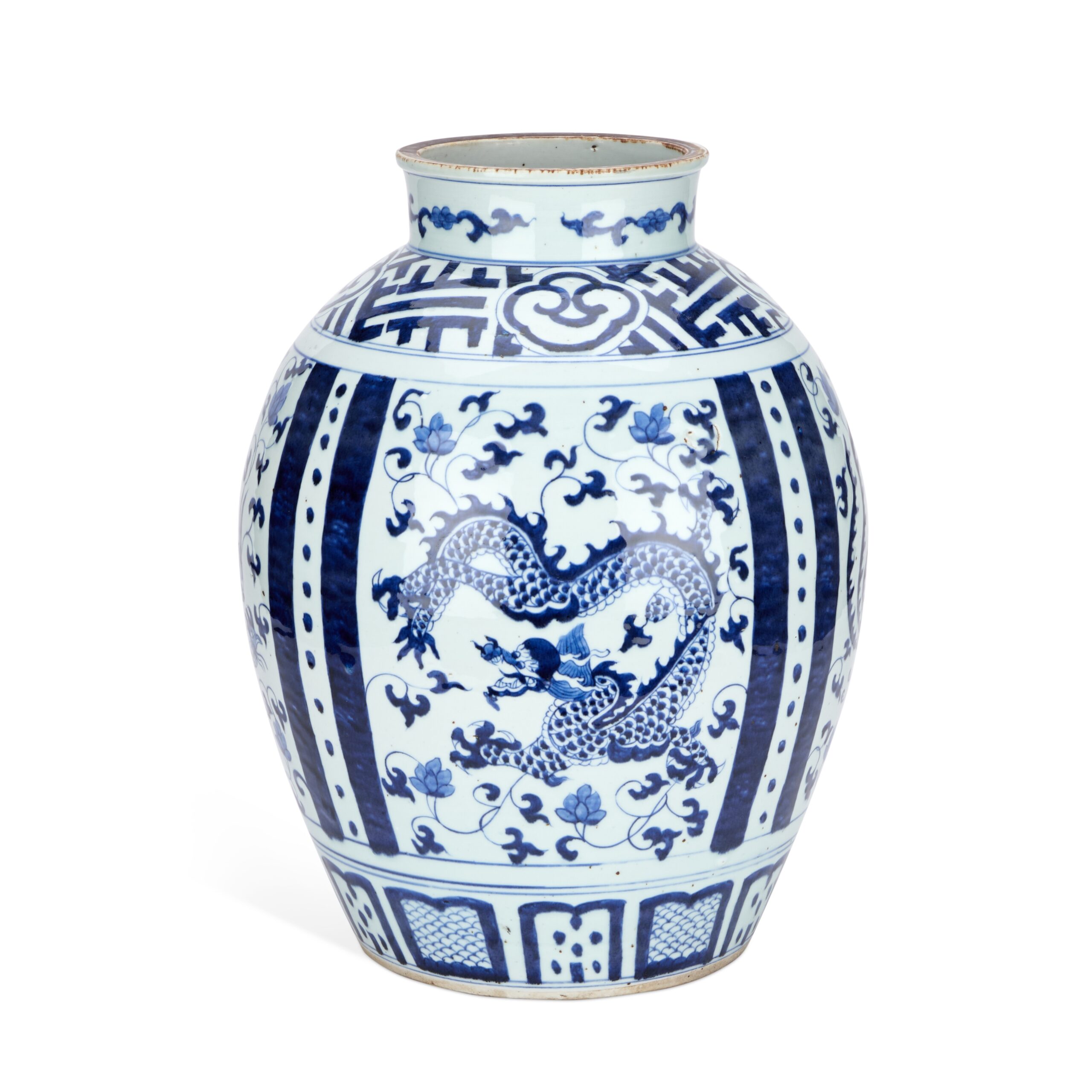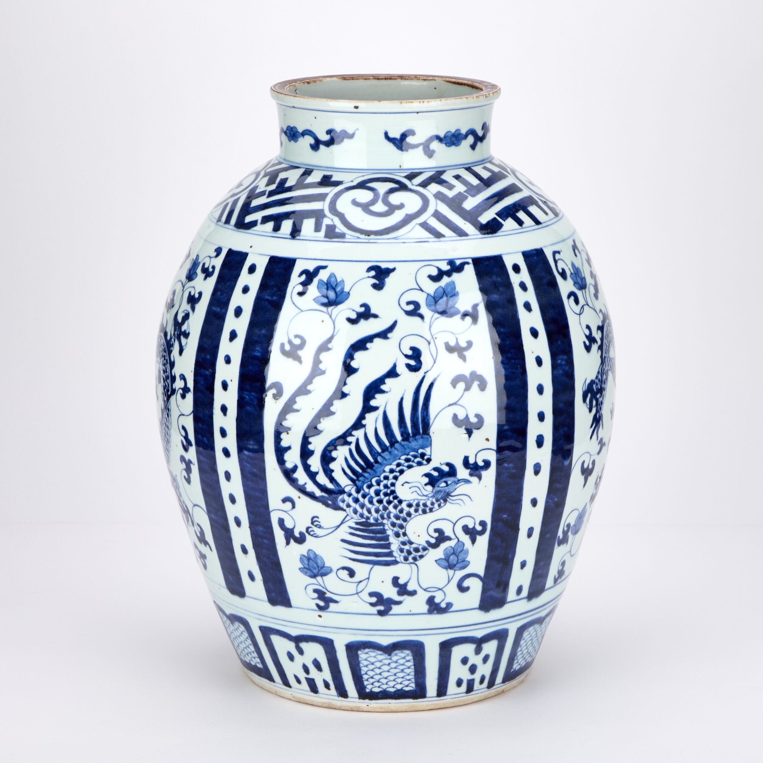 A large Chinese Qing Dynasty Dragon & Phoenix vase or lamp, of ovoid form painted in shades of blue and white with alternating panels with a five-clawed dragon pursuing a flaming pearl amidst scrolling lotus and phoenix, reserved within vertical lappet panels, the shoulder with key-fret and ruyi borders, the neck encircled by a floral band, above a band of stylised panels to the foot.