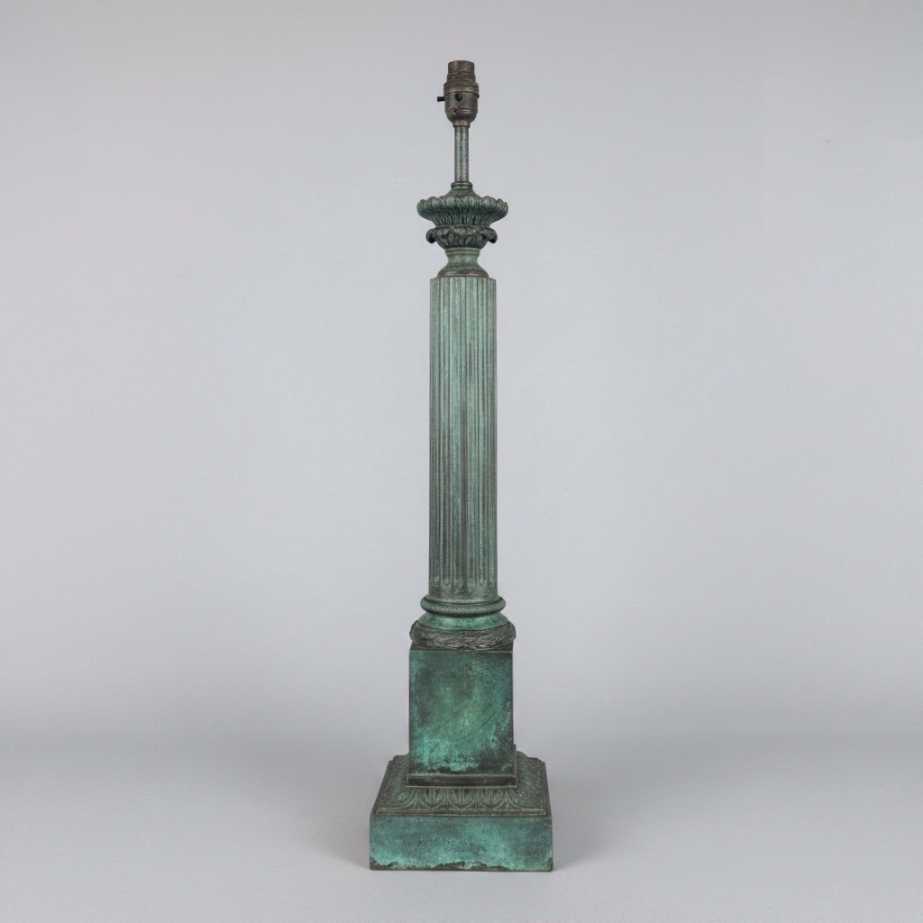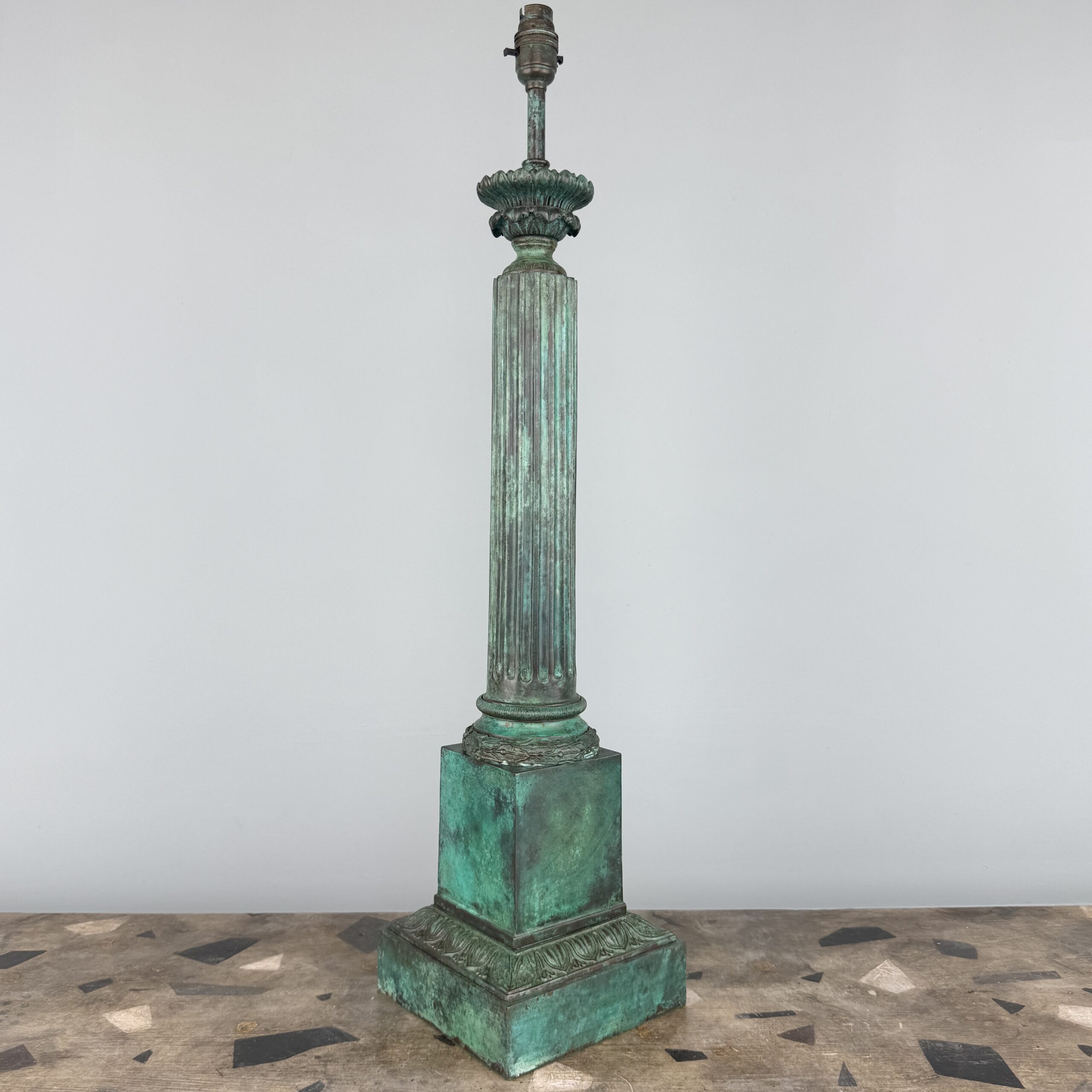 An unusual verdigris patinated bronze column carcel lamp. The foliate capital raised on fluted, tapering column standing on wreath socle over a stepped plinth base with leaf-cast moulding.