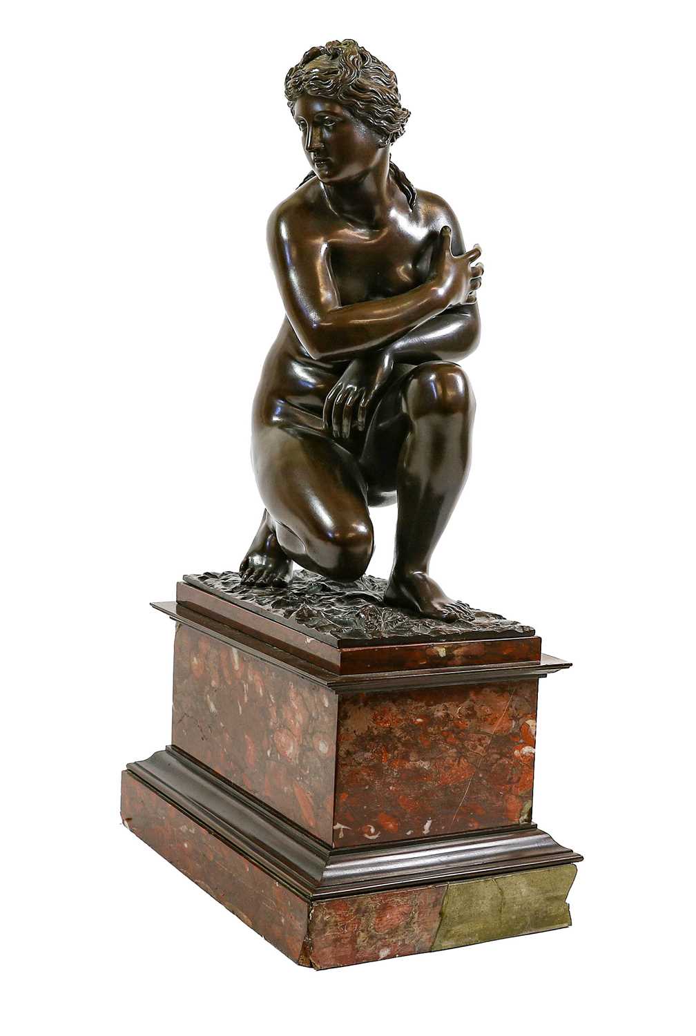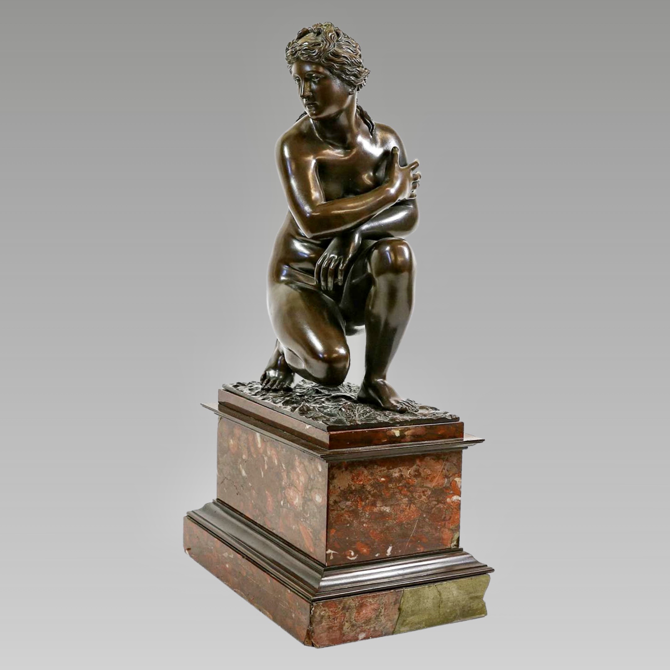 A fine bronze of the Crouching Venus shown on a naturalistic base on one knee, her arms held across her body, her hair dressed in antique style, raised on a Griotte marble plinth with bronze mouldings