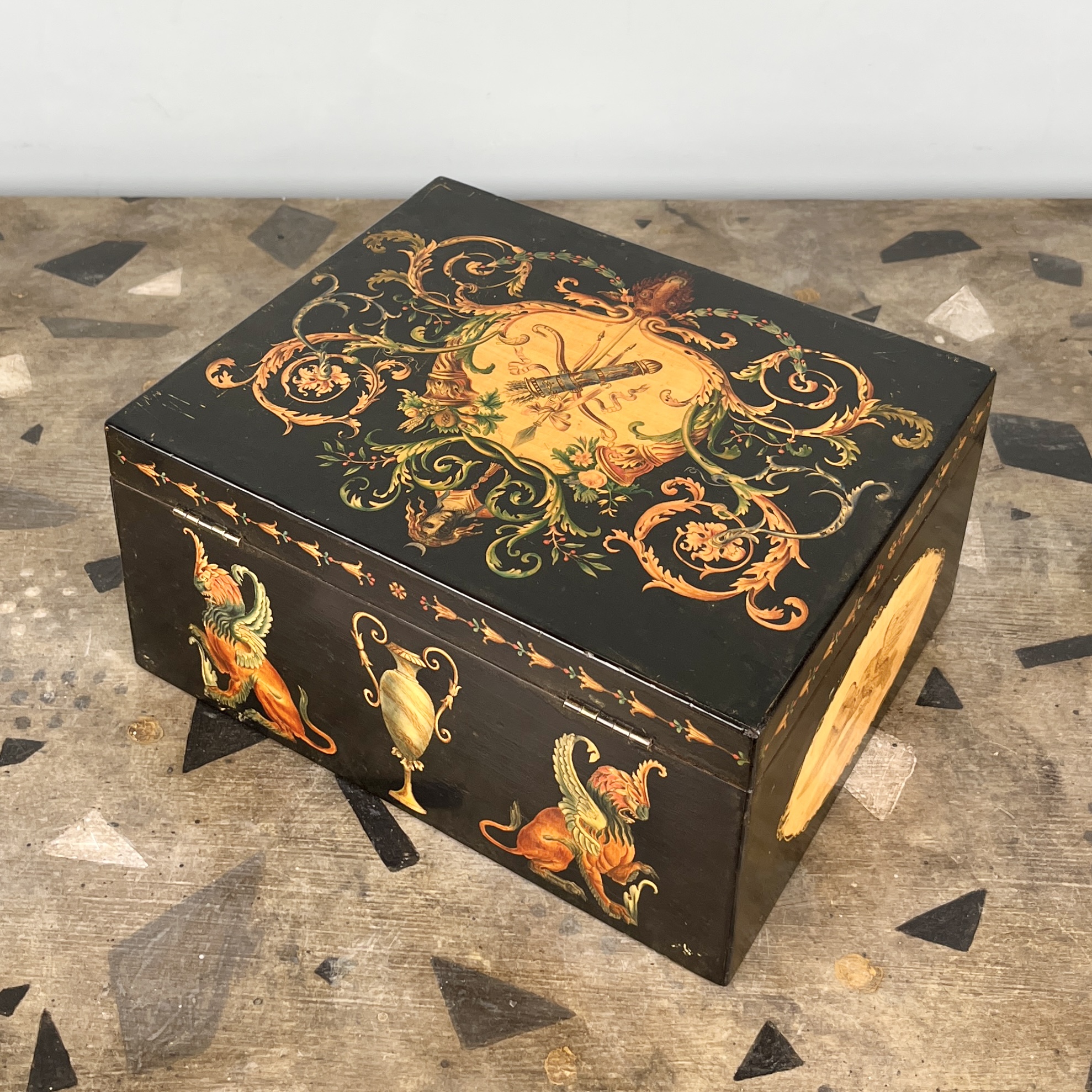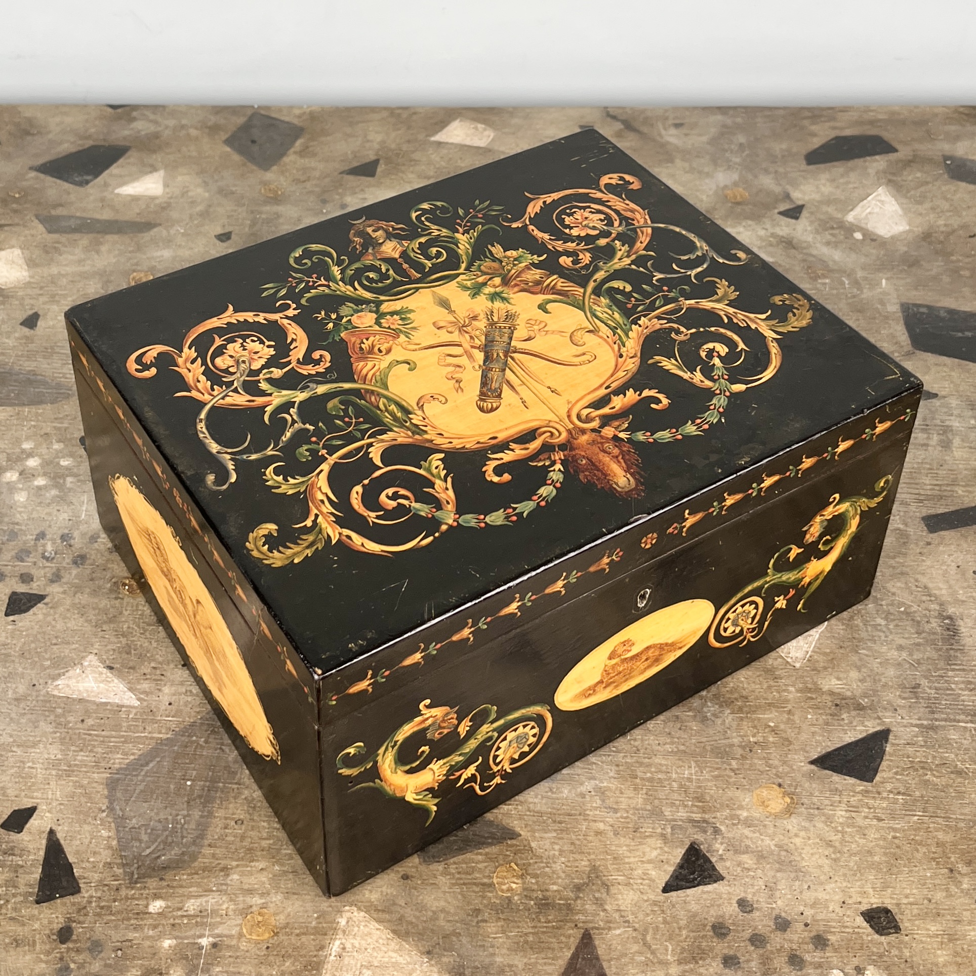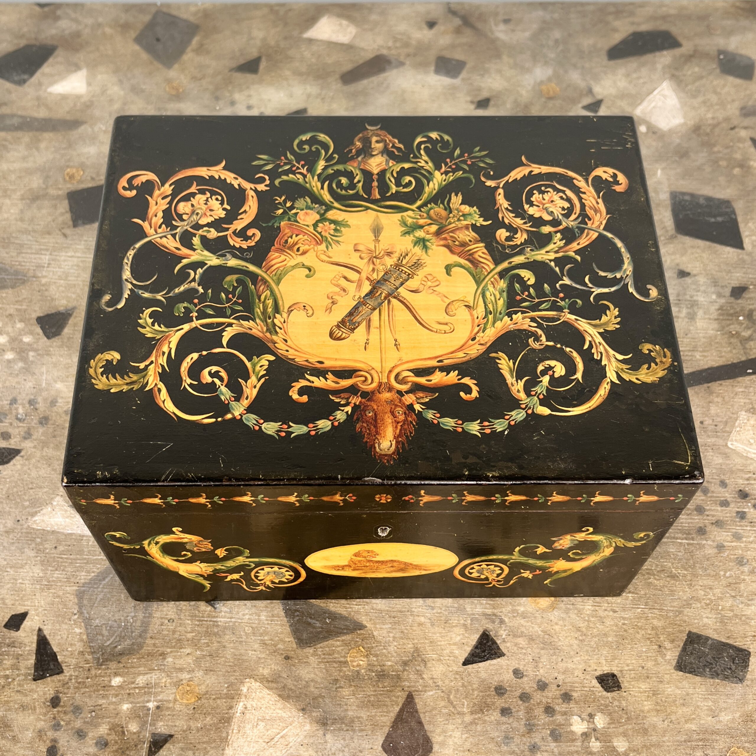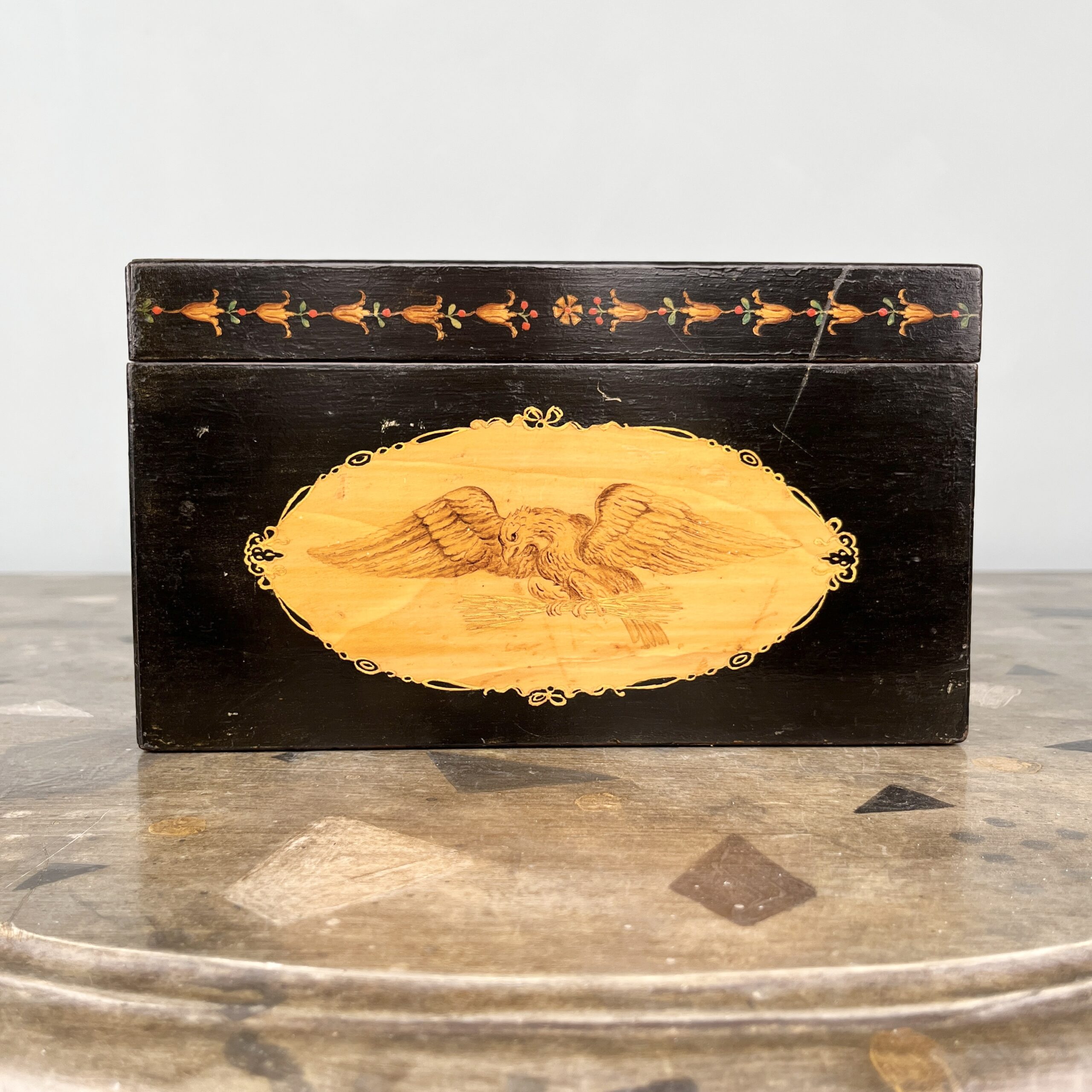 A rare Federal pen-work box, decorated all over with exceptional polychrome penwork against a black ground, the top with a trophy of a bow and quiver of arrows within an elaborate cartouche of foliate scrollwork and cornucopia and with a crest of a female bust. The front with an oval painted with a panther or leopard, the sides each with an eagle clutching arrows; the back with an urn flanked be addorsed griffins
