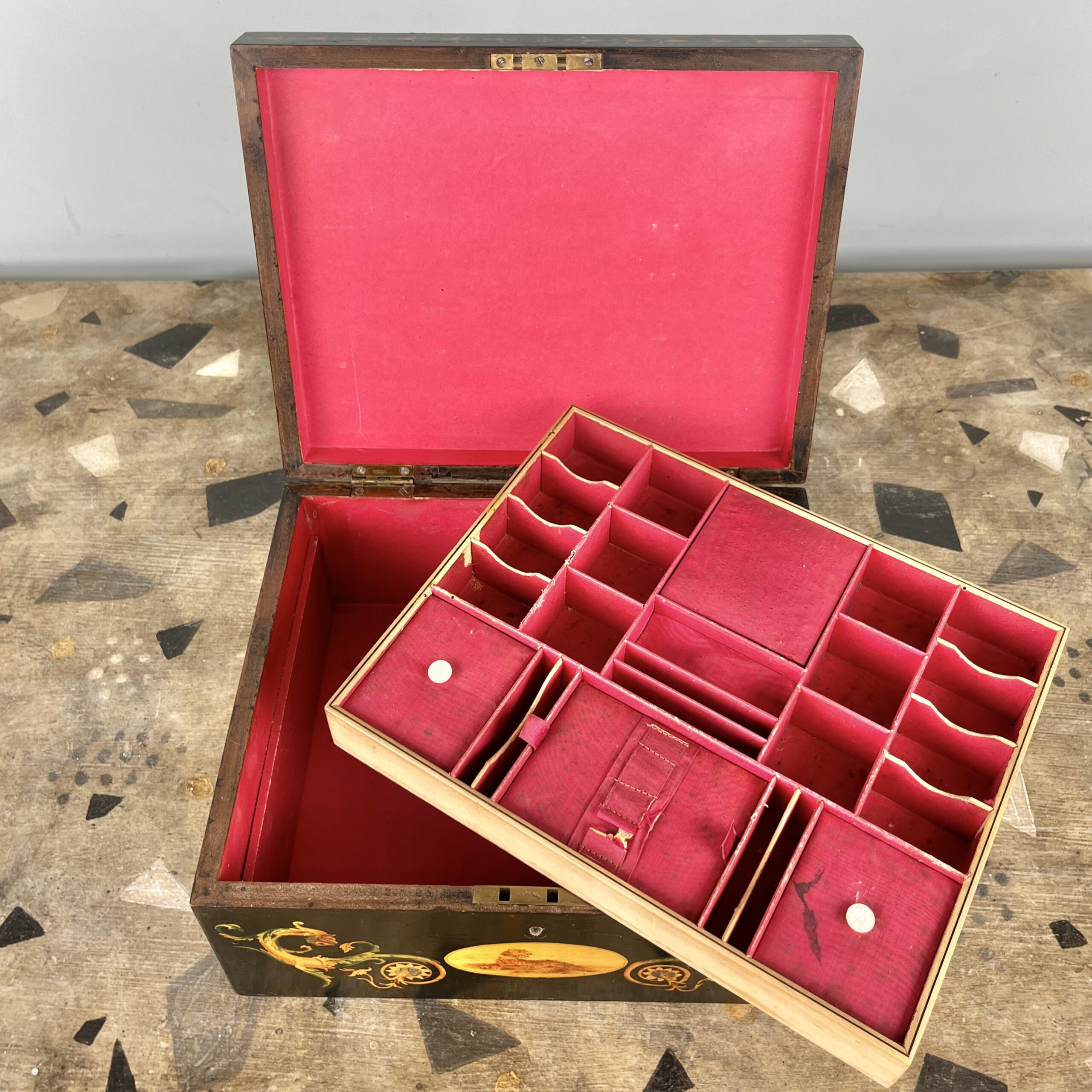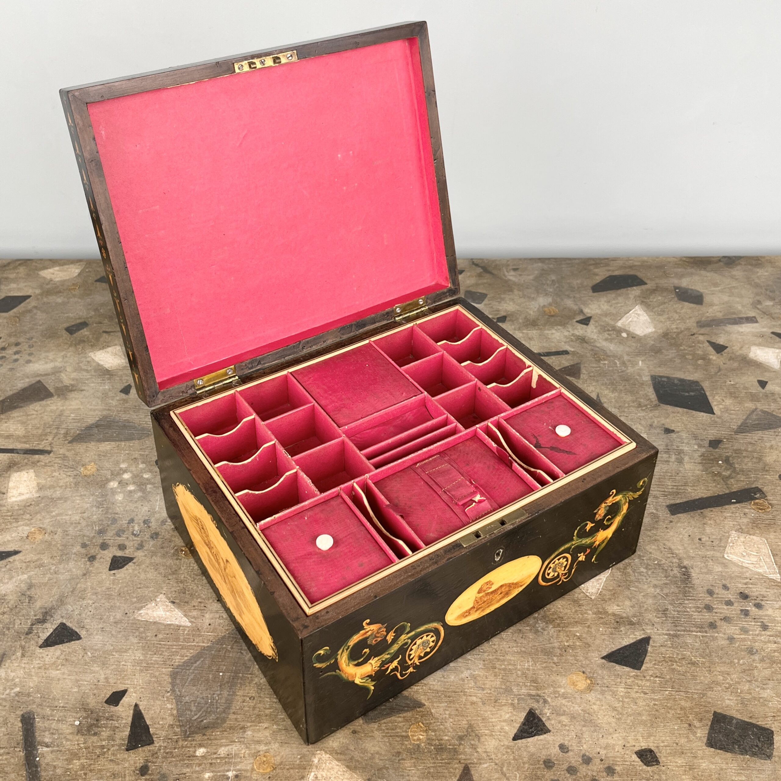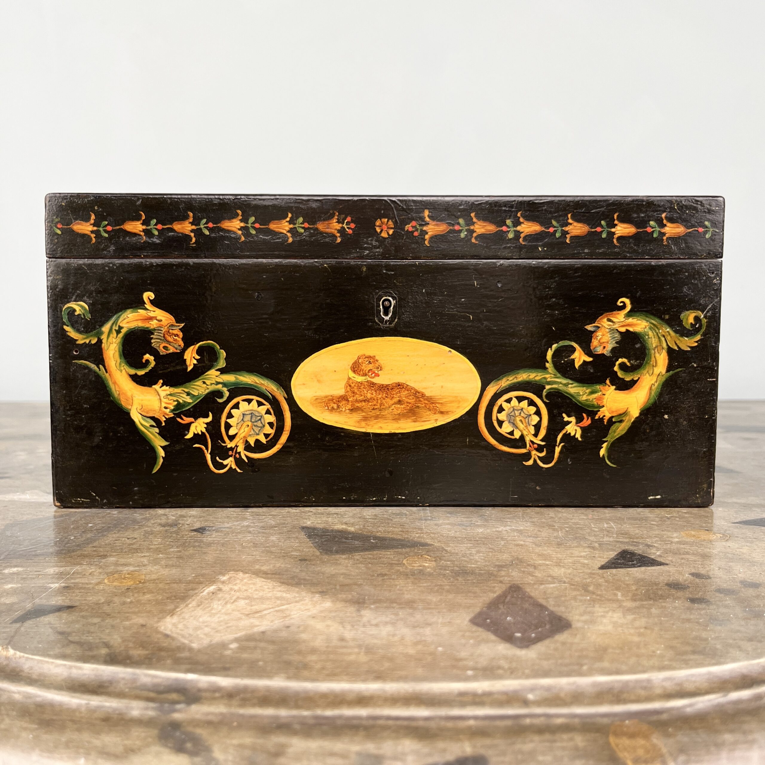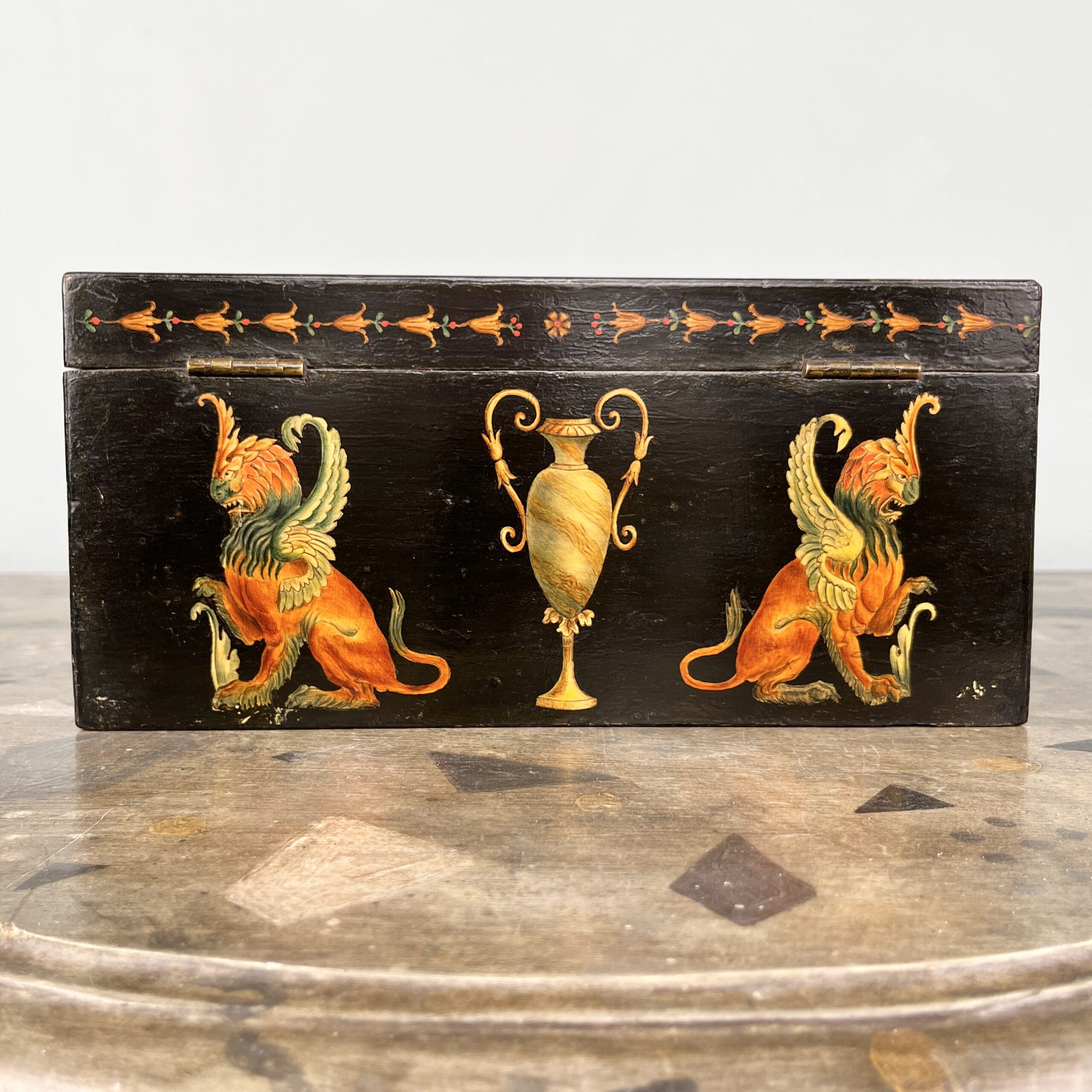 A rare Federal pen-work box, decorated all over with exceptional polychrome penwork against a black ground, the top with a trophy of a bow and quiver of arrows within an elaborate cartouche of foliate scrollwork and cornucopia and with a crest of a female bust. The front with an oval painted with a panther or leopard, the sides each with an eagle clutching arrows; the back with an urn flanked be addorsed griffins