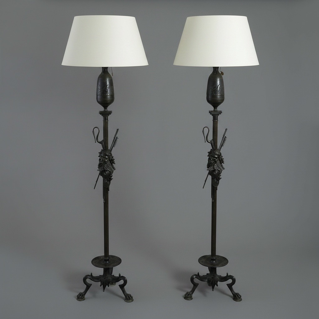 A fine pair of Neoclassical bronze standard lamps, probably by the Chiurazzi Foundry of Naples, in Etruscan revival Thymiaterion style and each in the form of a vase cast with a leopard supported on a columnar stem faced with a Bacchic trophy incorporating pan-pipes and a mask, raised on a zoomorphic tripod bases. Originally oil lamps and now wired for electricity.