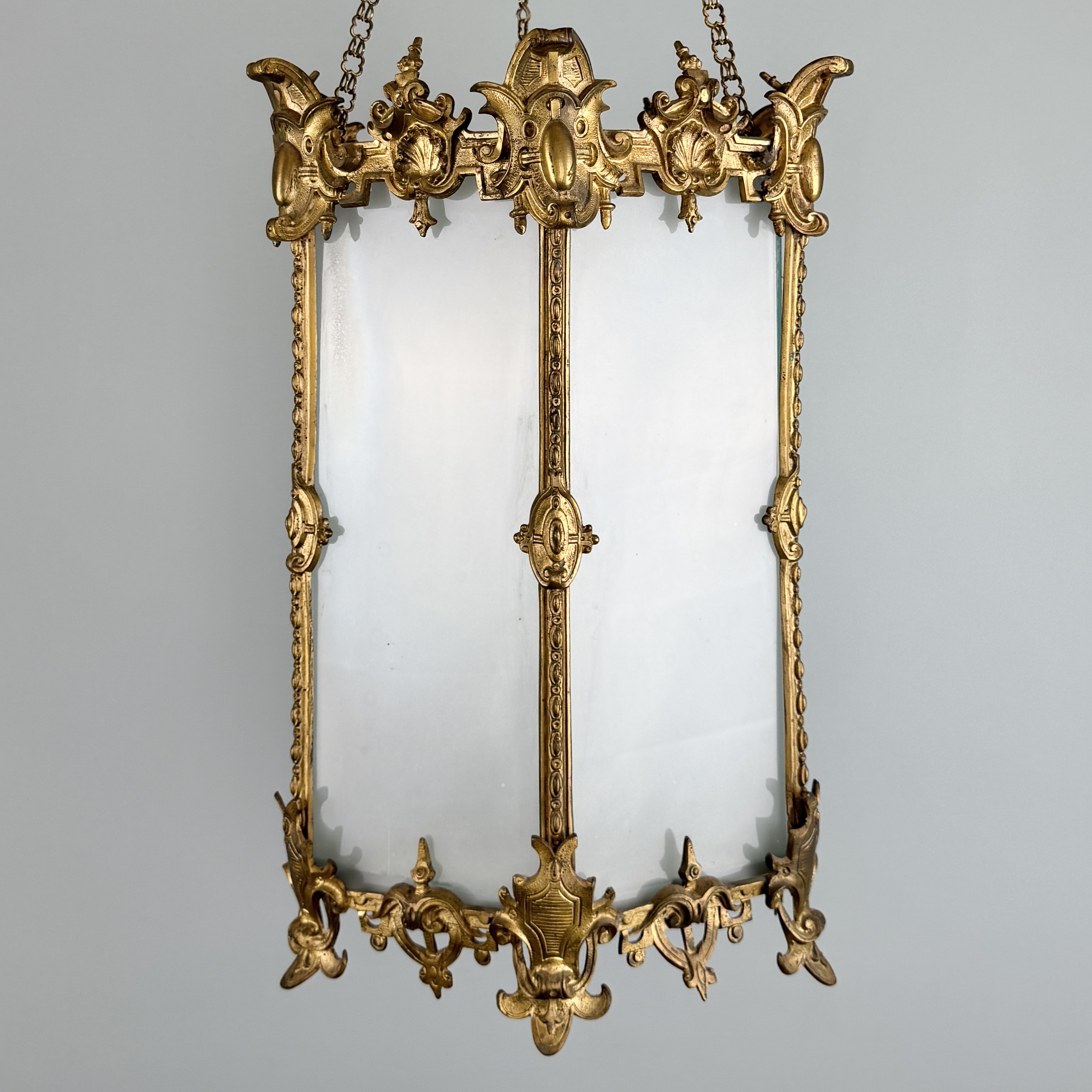 A fine antique Victorian renaissance revival gilt bronze hanging lantern, the hexagonal body with opaque glass panels and a door to one side, the base with central acanthus leaf pendant; suspended from three quatrefoil link chains