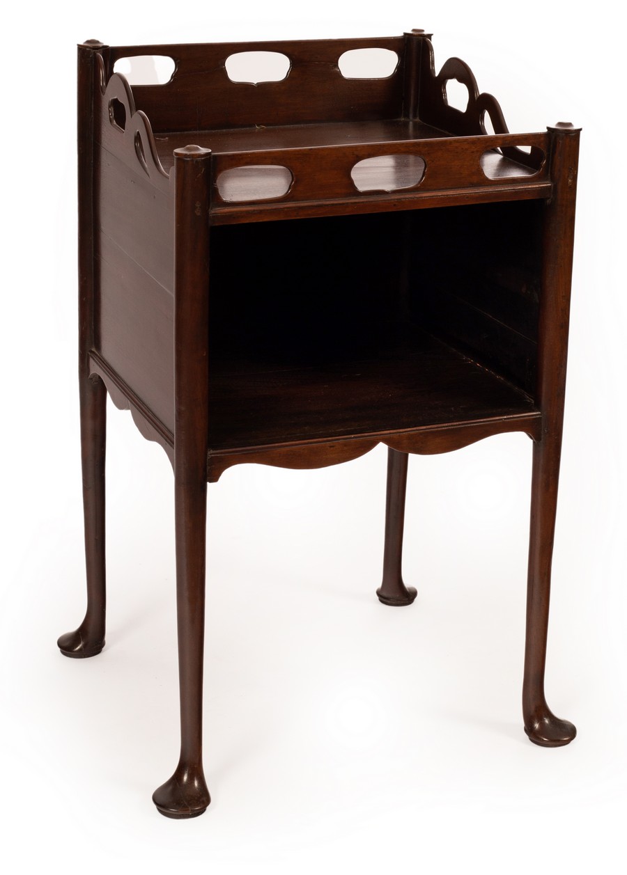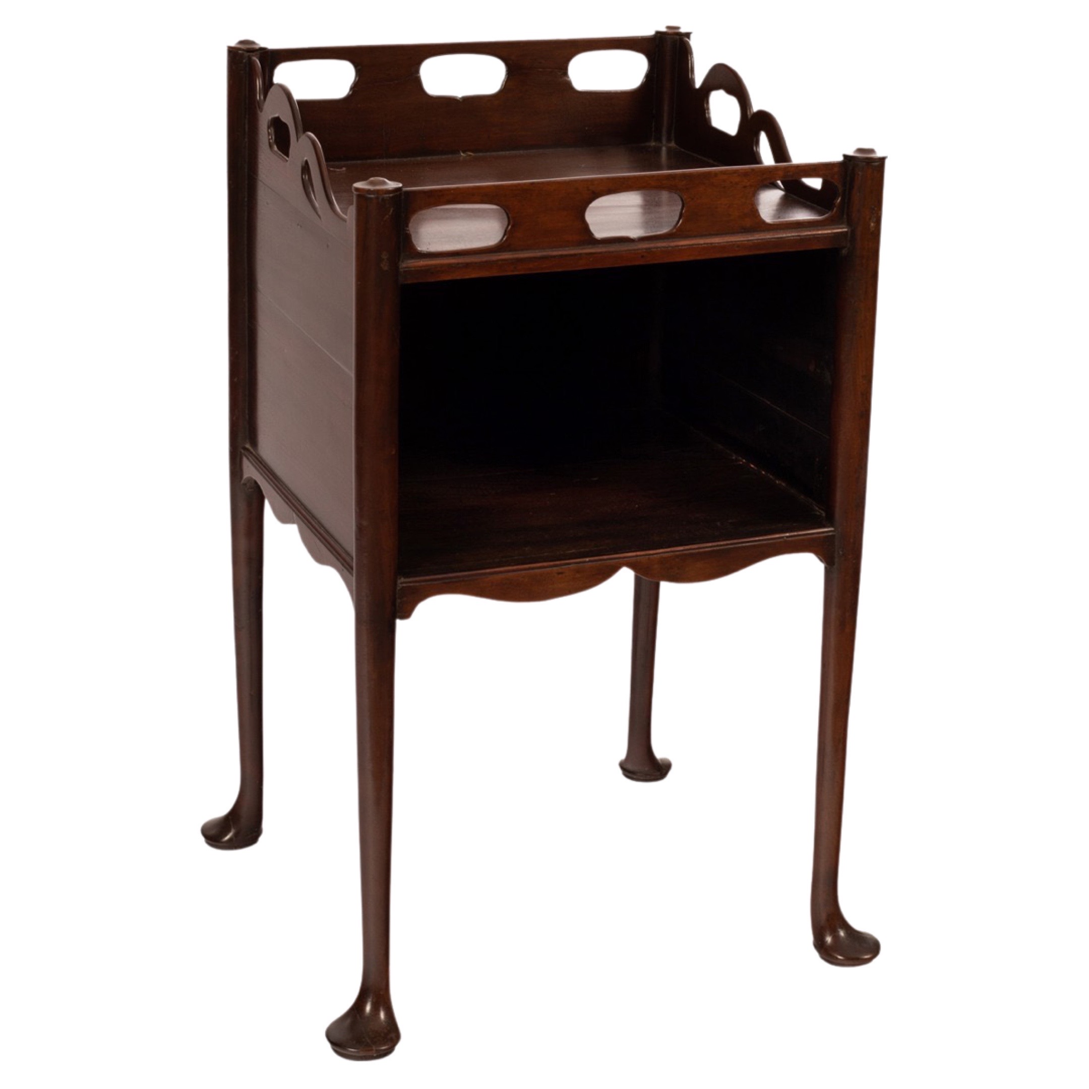 A sweet George IIIĀ mahogany bedside table or night stand with exaggerated pierced gallery above an open shelf and raised on turned legs with pad feet