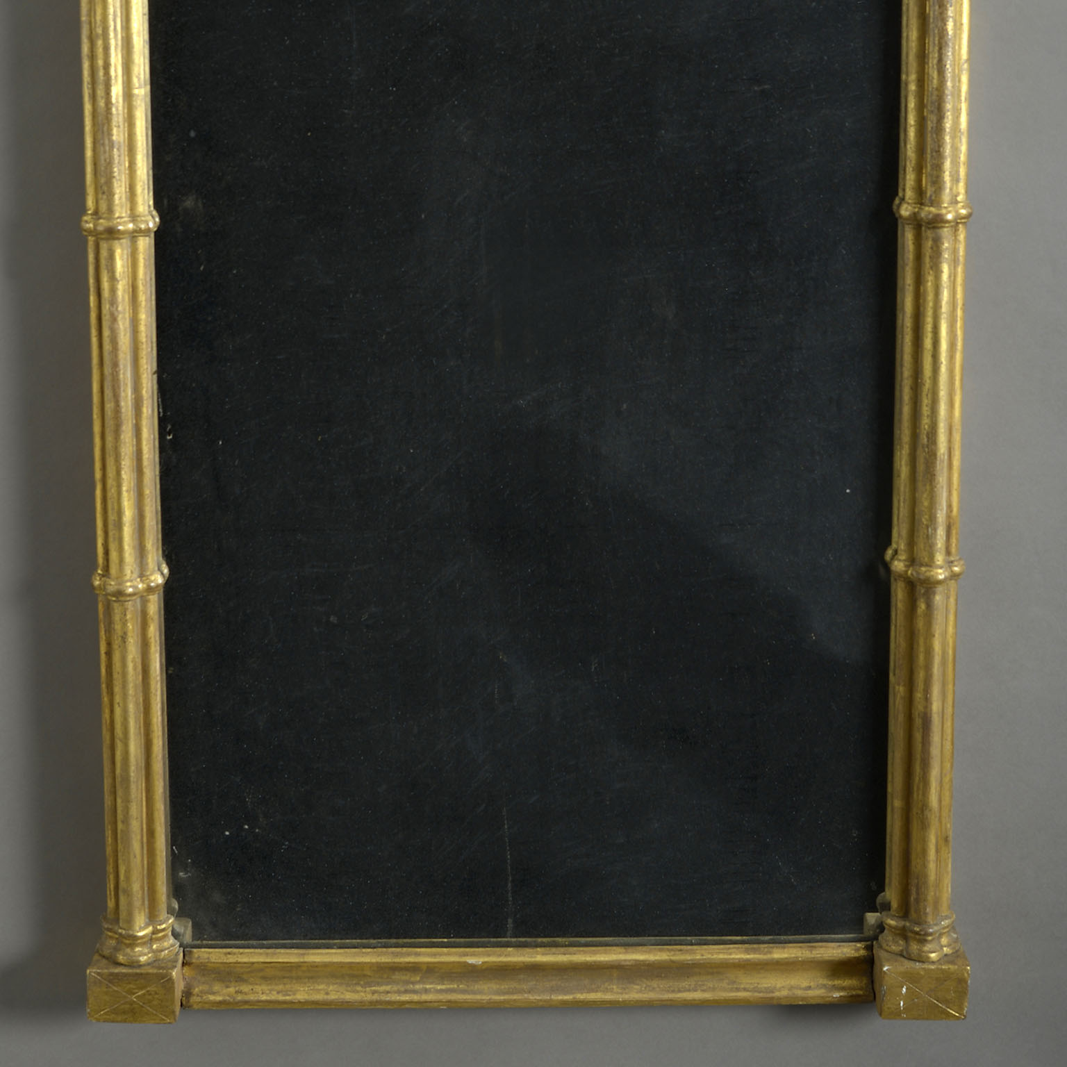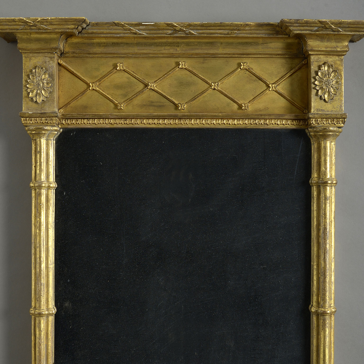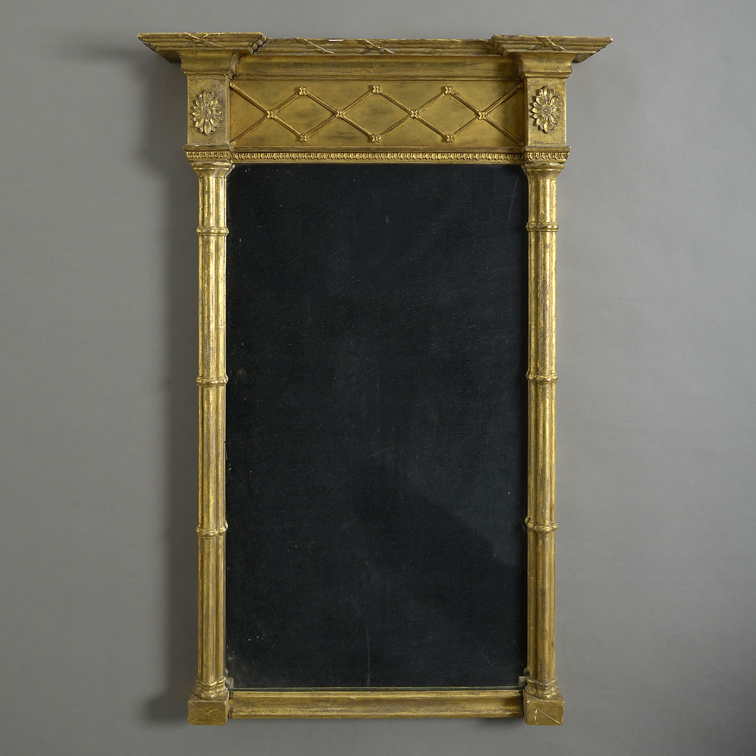 A George III gilt-wood mirror or pier glass, the original, rectangular, mercurial silvered plate contained within a giltwood frame of flanking cluster columns supporting paterae blocks and a blind fretwork lattice frieze below an inverted break-front cornice.