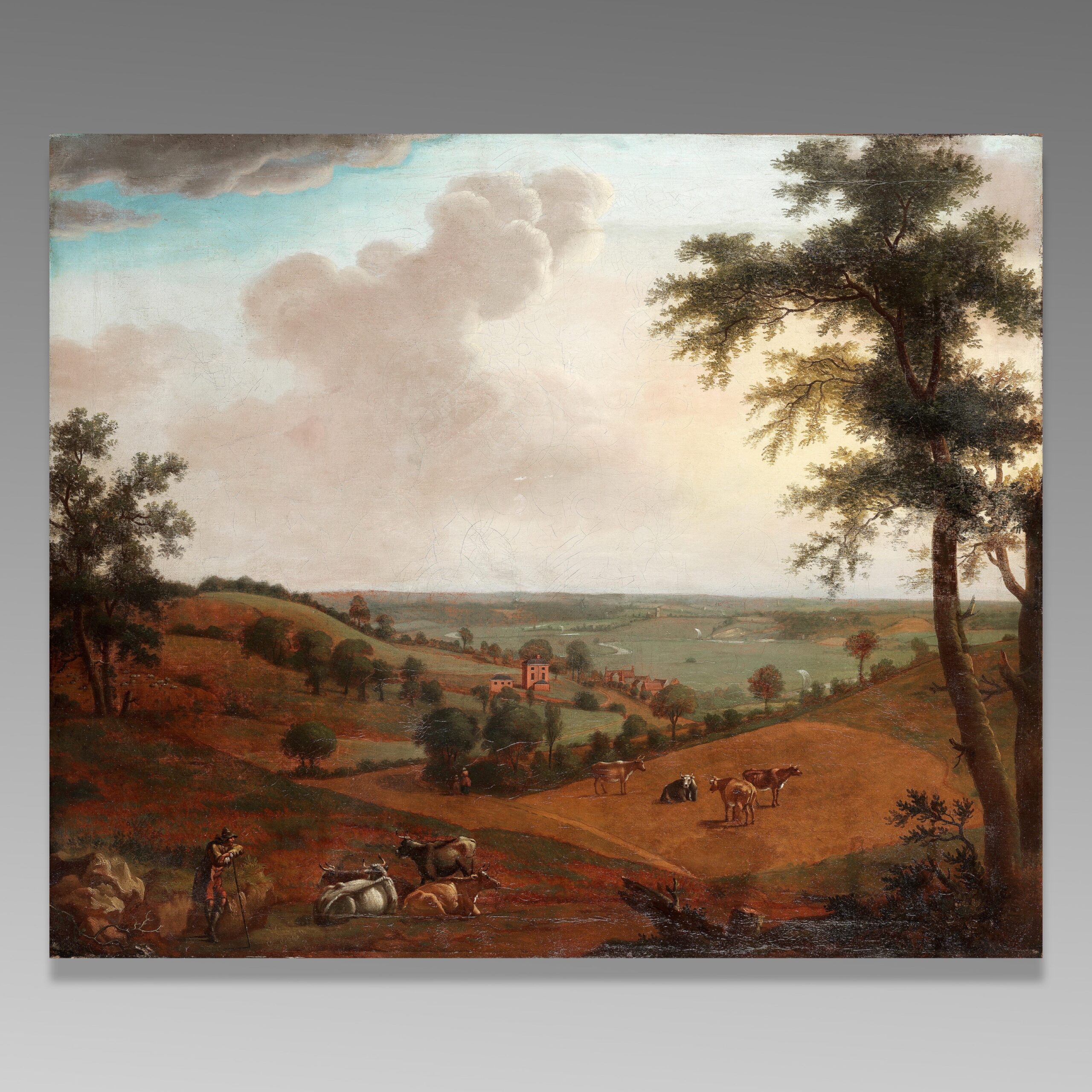 A large George III painting of an extensive landscape with a cluster of buildings beside a meandering river with sailboats, a drover with his herd in the foreground; all beneath a dramatic sky. Oil on canvas (unframed)