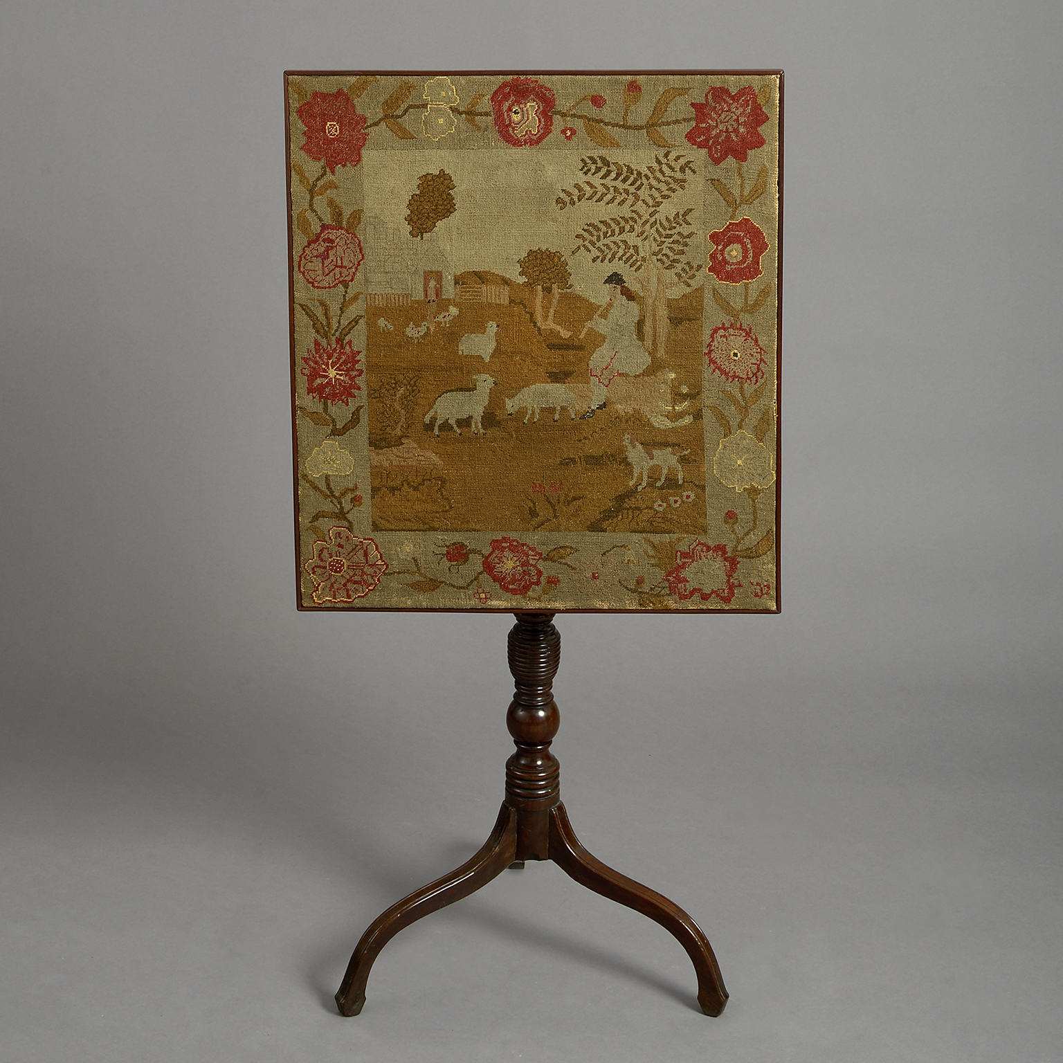 the rectangular needlework top worked with a scene of a shepherd with his flock, raised on a turned stem with tripod base