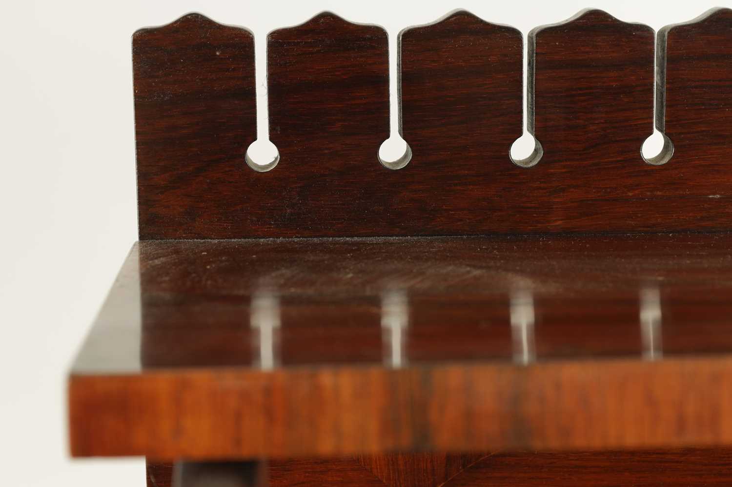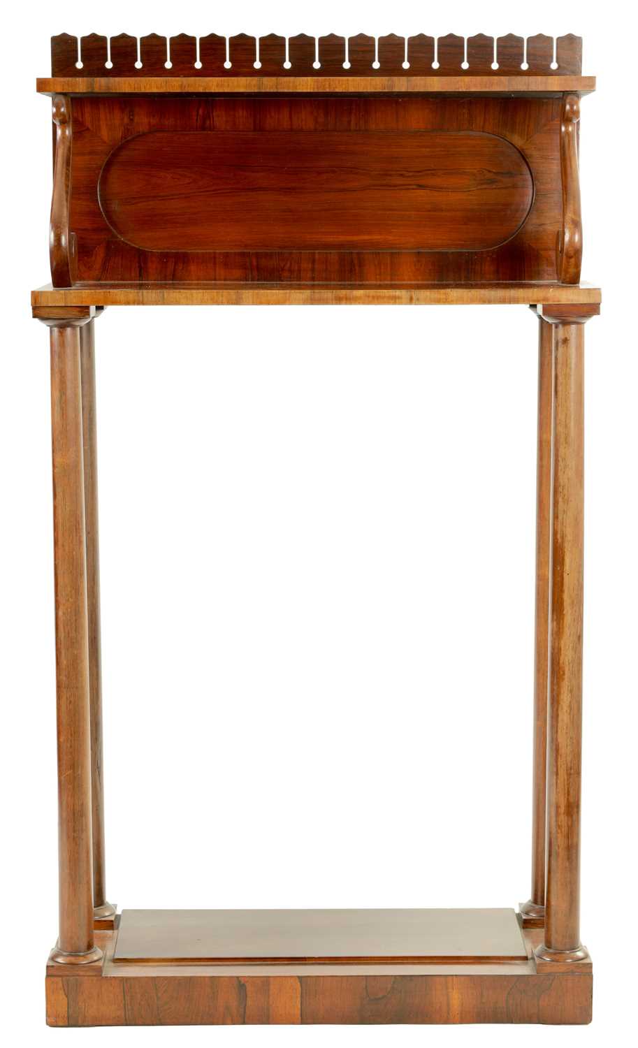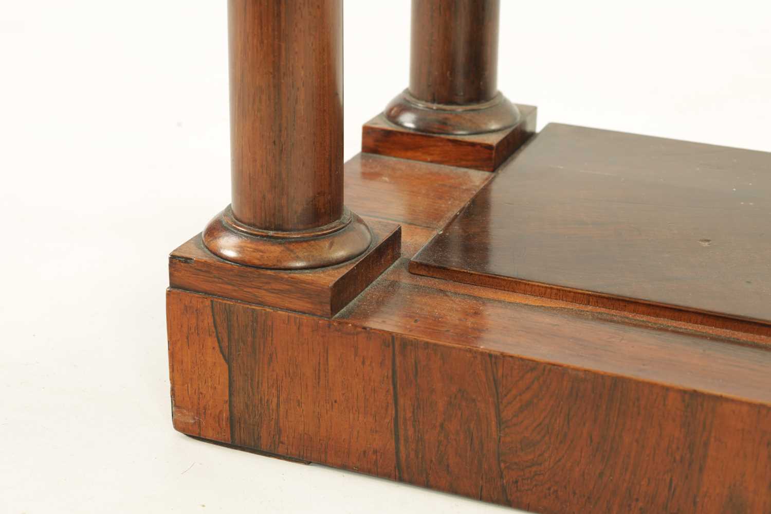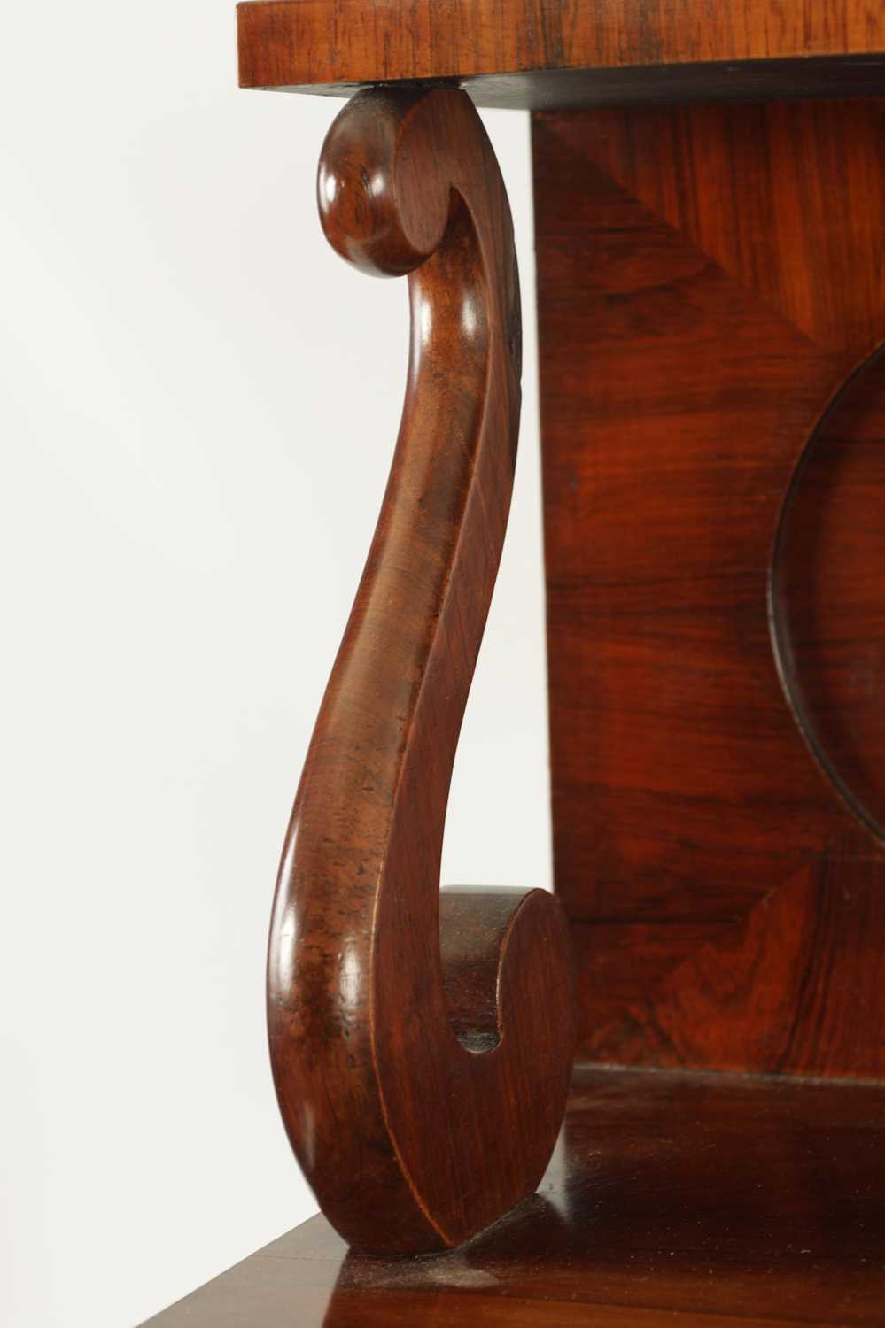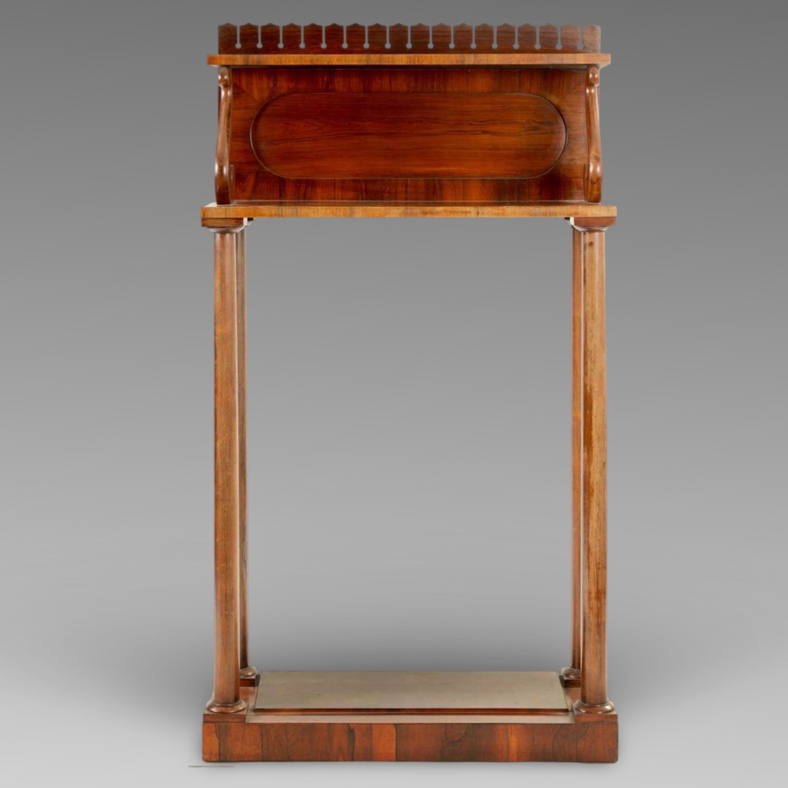 George IV rosewood small console table or side table, the raised back panel with lappet cornice and supporting a shelf on scroll supports, the rectangular top raised on turned columnar legs standing on a plinth base.