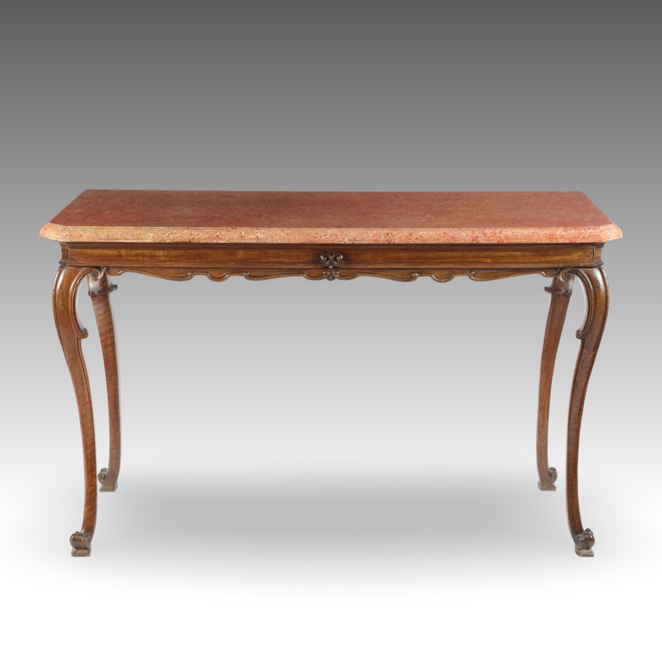 An elegant Italian walnut side table or console table. The moulded, faux marble painted wood top above a serpentine carved shaped apron on slender cabriole legs and scrolled toes