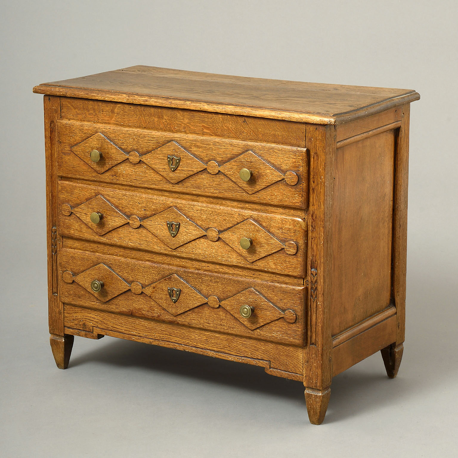 A Louis XVI oak small commode or chest of drawers, the three drawers faced by chains of lozenges with brass pulls and raised on tapering feet. Ideal as a table beside an armchair