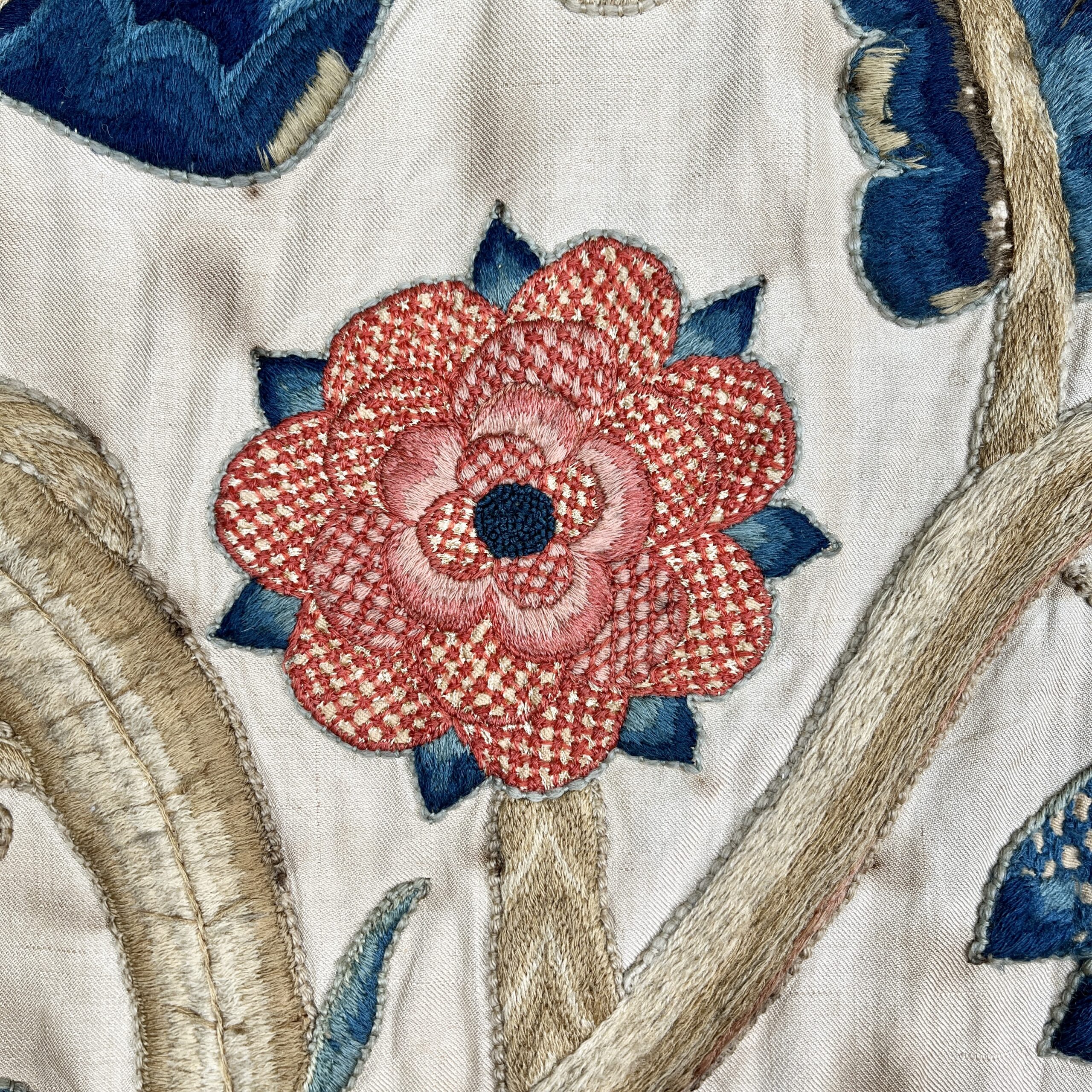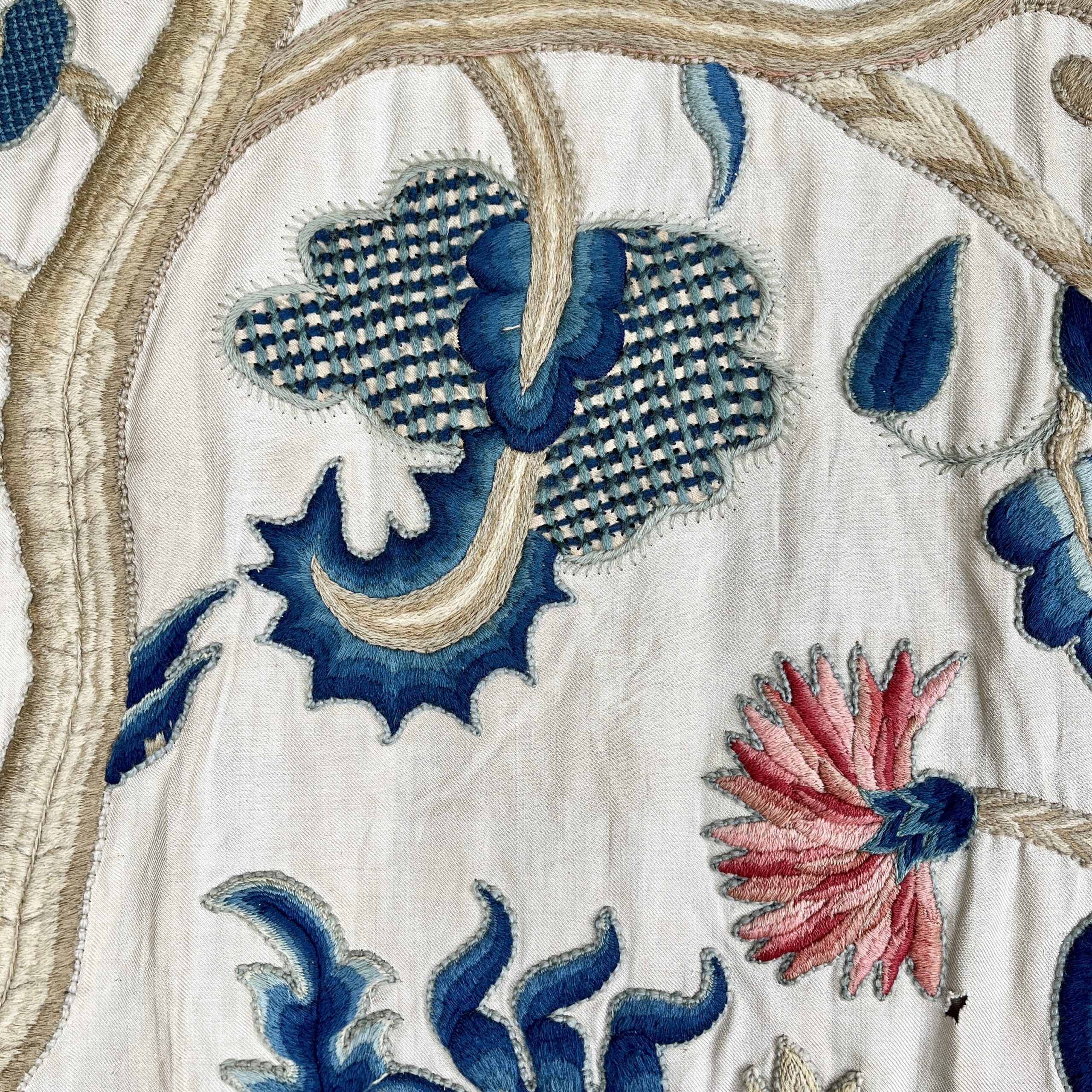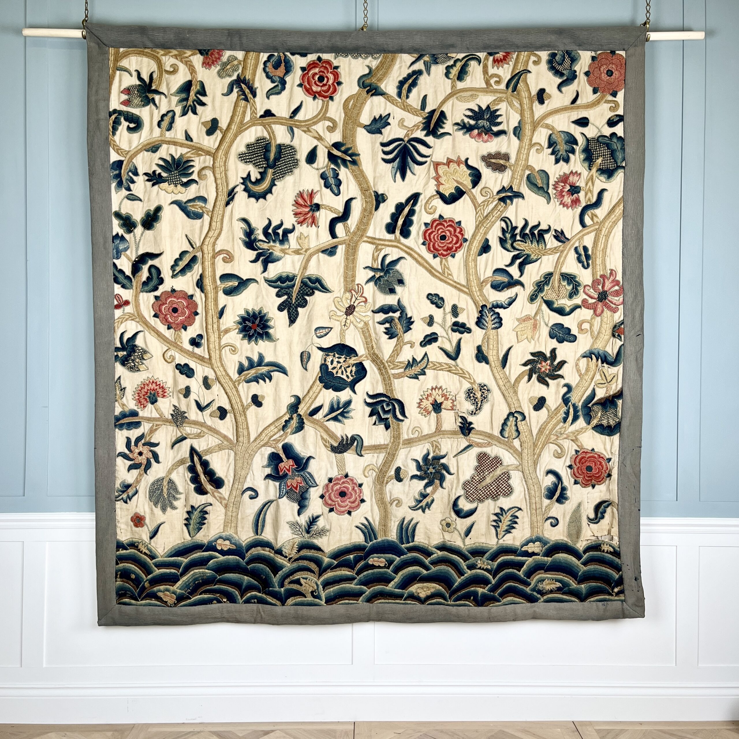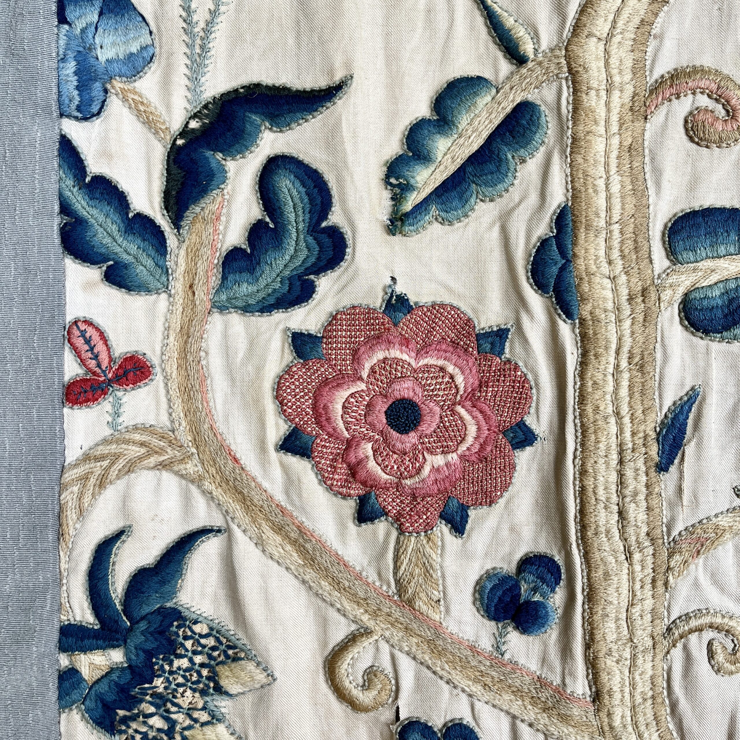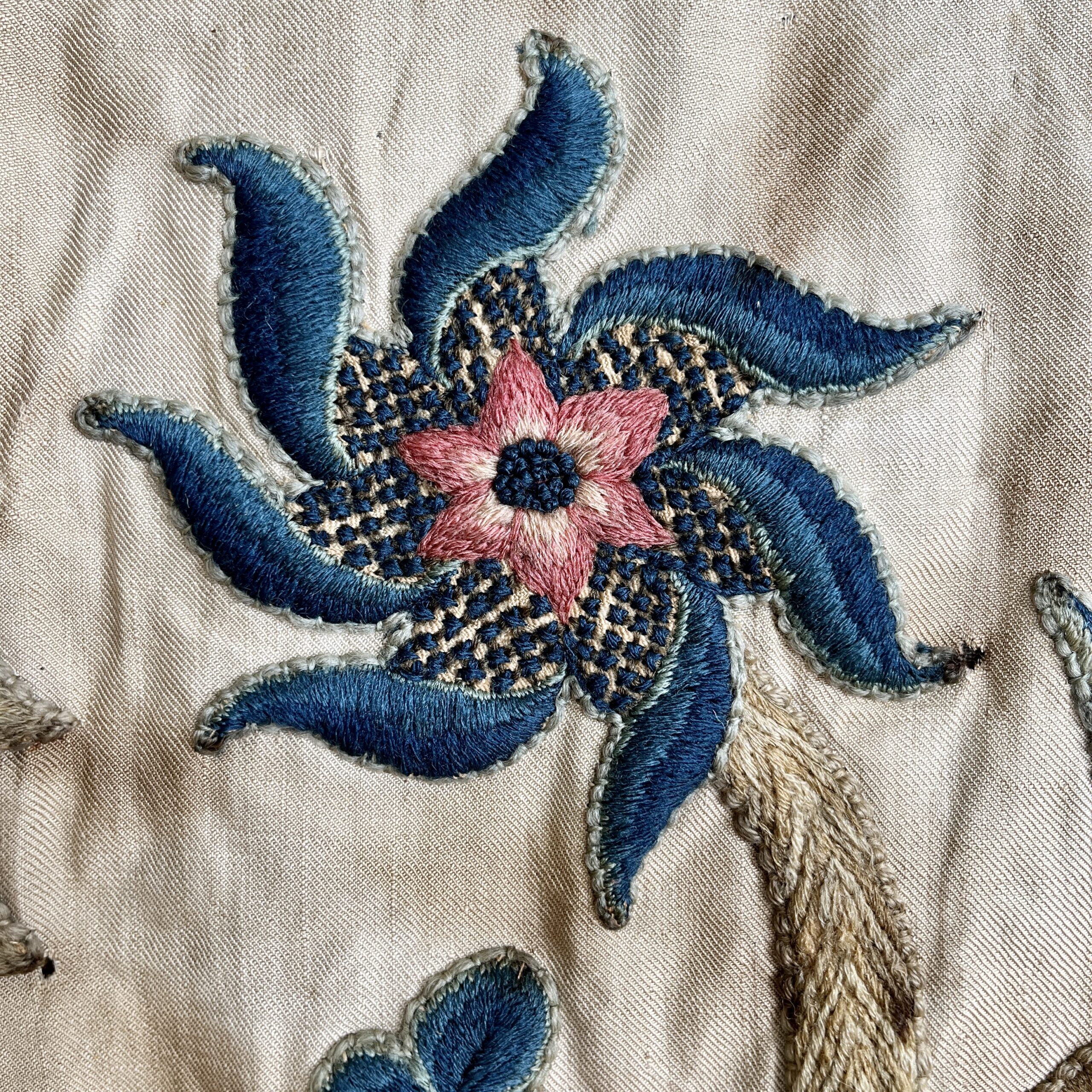 Such colourful woollen embroideries on linen grounds were popular for four poster beds and wall hangings from the late Elizabeth period & especially in the last half of the 17th century, the swirling & exotic tree of life designs were influenced by Hindu textiles brought to Europe by the pioneering East India Co., the designs were anglicised so you can see here acorn leaves & plentiful heraldic roses, the roses in the offered works are an uncommon feature and make a powerful statement of allegiance therefore, it’s intriguing to speculate on actual royal connections, the Tudor rose remained a symbol of monarchy, of union & of England throughout the 17th century, William & Mary adopted it as an emblem of their rule, it appears on decorative objects they commissioned such as delftware, items sometimes given as gifts to nobility & supporters. They could be used for a bed project but are also a great size to make a bold statement as wall hangings.