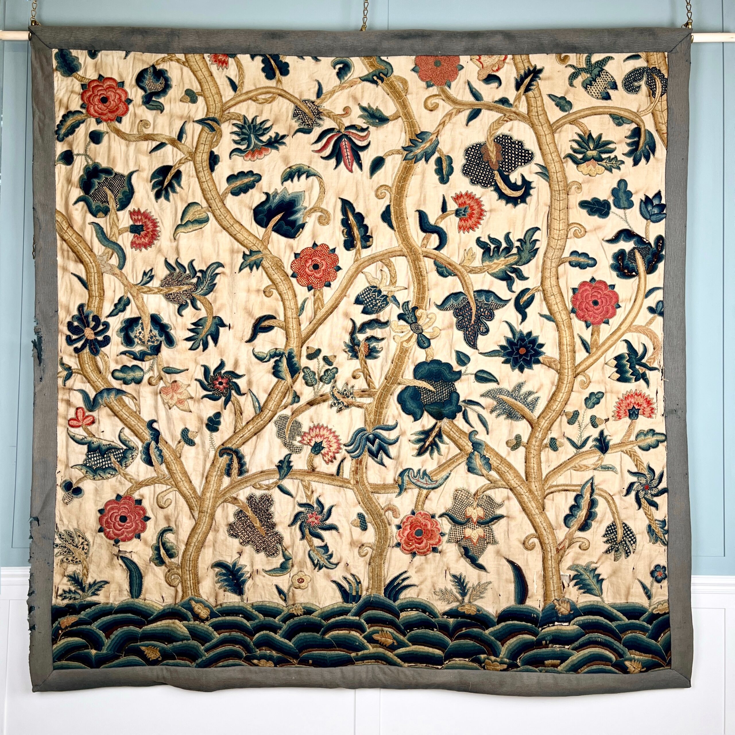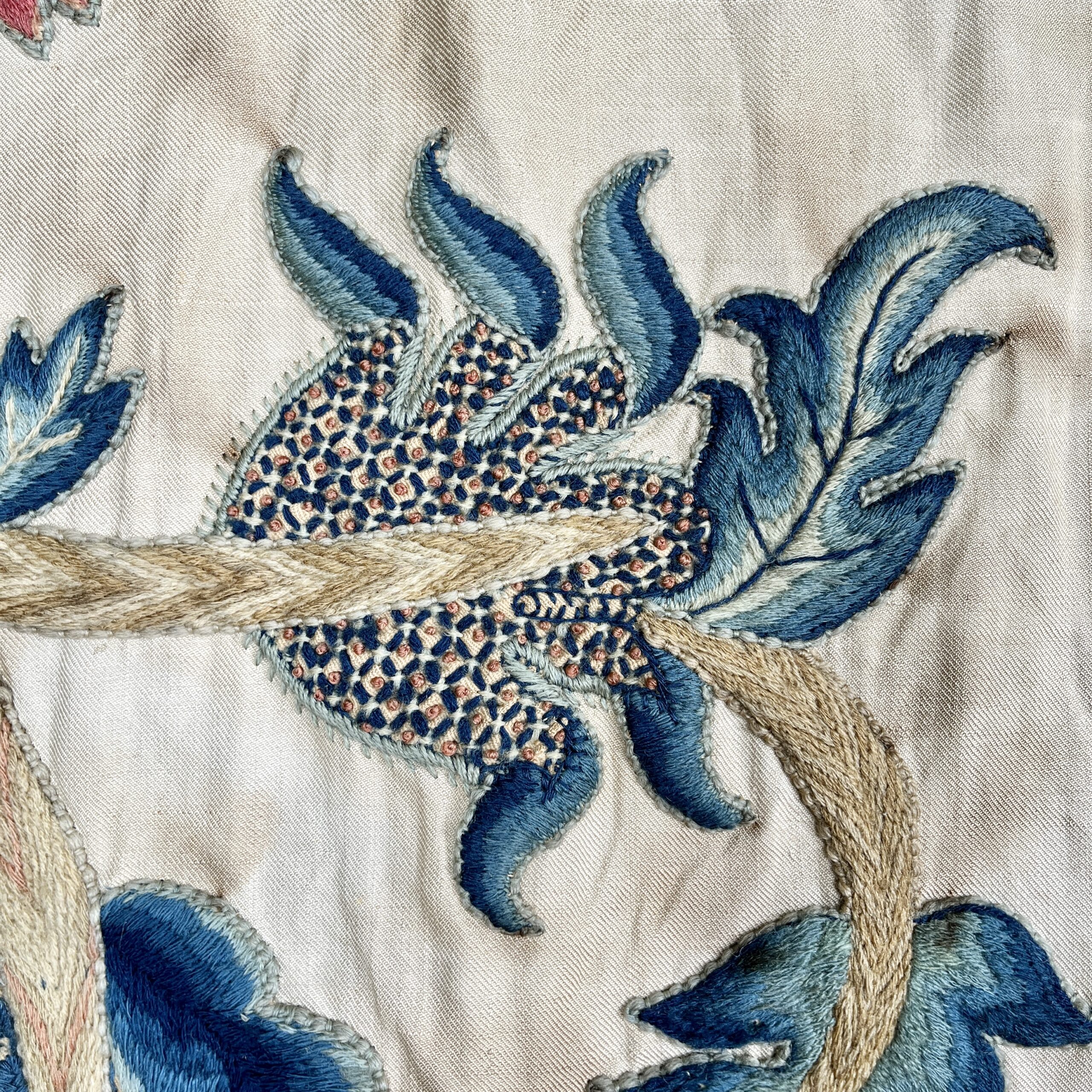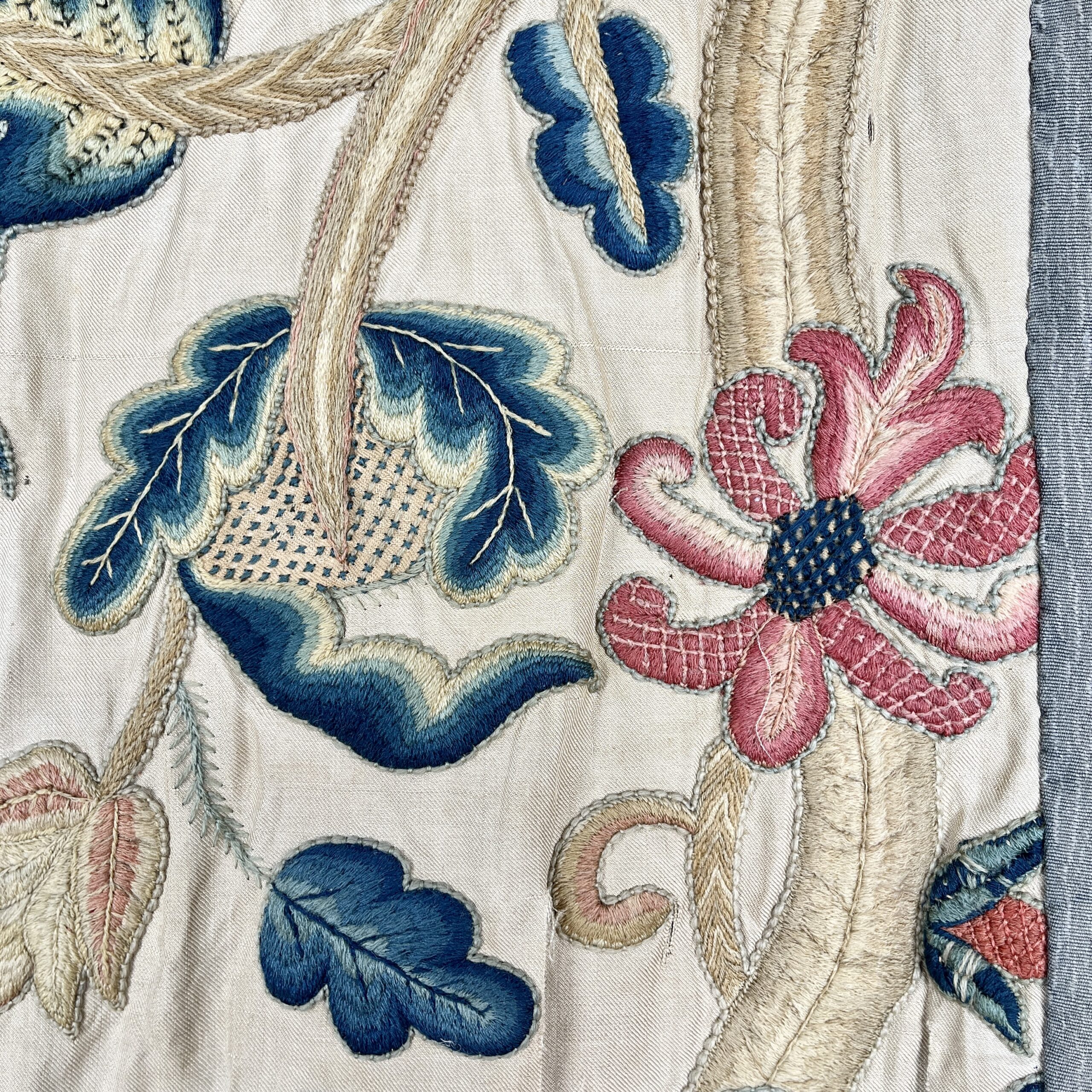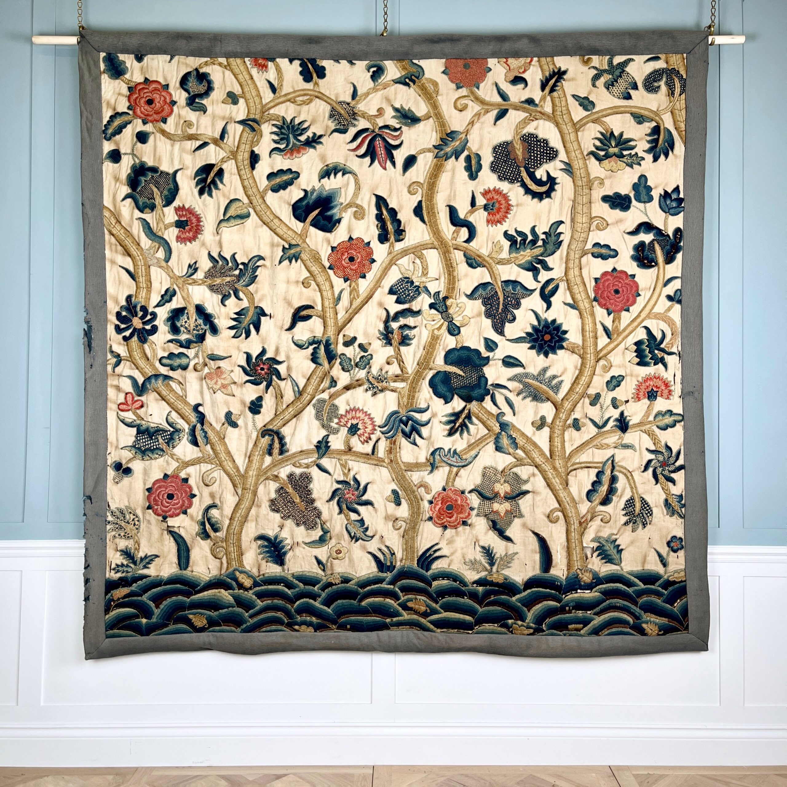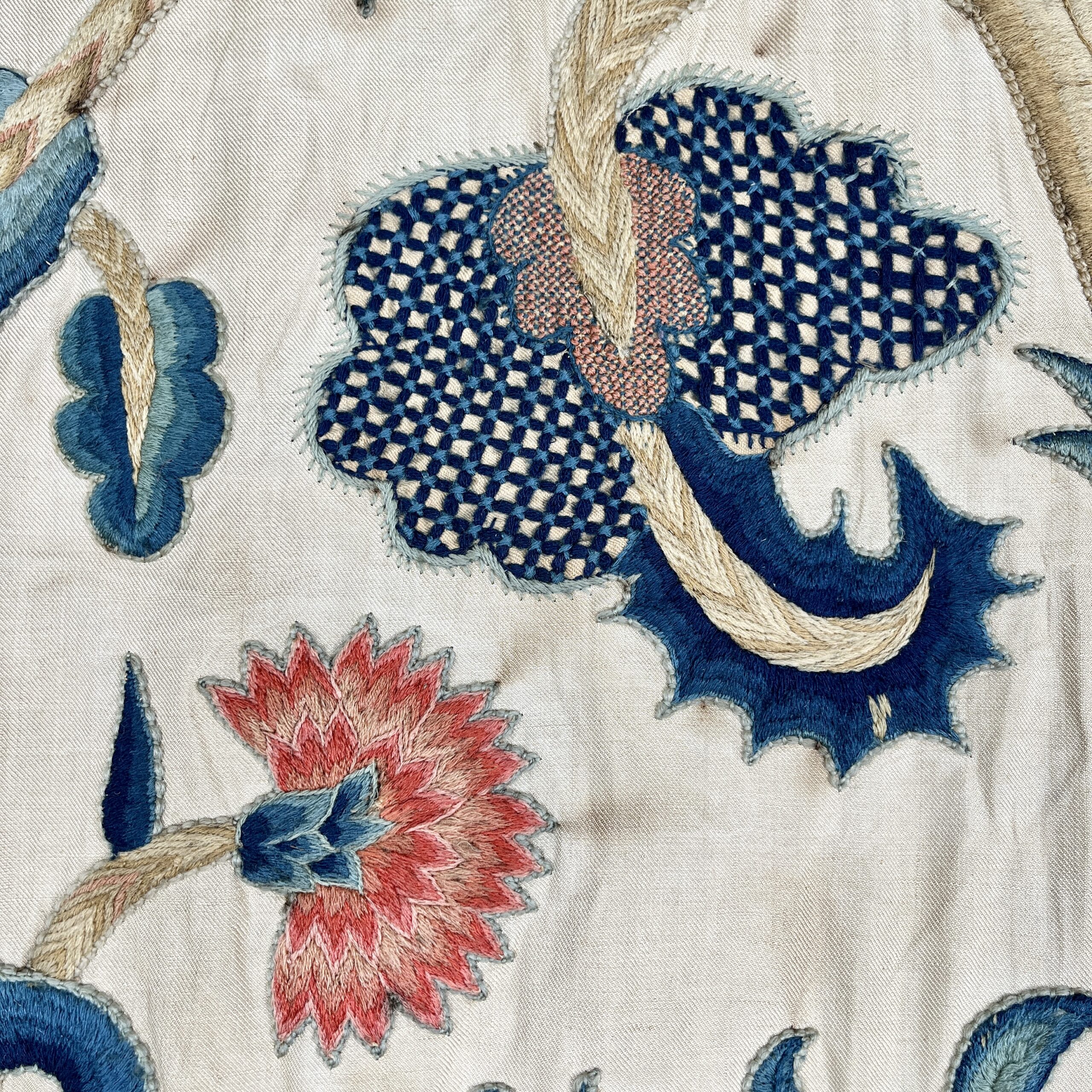 Such colourful woollen embroideries on linen grounds were popular for four poster beds and wall hangings from the late Elizabeth period & especially in the last half of the 17th century, the swirling & exotic tree of life designs were influenced by Hindu textiles brought to Europe by the pioneering East India Co., the designs were anglicised so you can see here acorn leaves & plentiful heraldic roses, the roses in the offered works are an uncommon feature and make a powerful statement of allegiance therefore, it’s intriguing to speculate on actual royal connections, the Tudor rose remained a symbol of monarchy, of union & of England throughout the 17th century, William & Mary adopted it as an emblem of their rule, it appears on decorative objects they commissioned such as delftware, items sometimes given as gifts to nobility & supporters. They could be used for a bed project but are also a great size to make a bold statement as wall hangings.