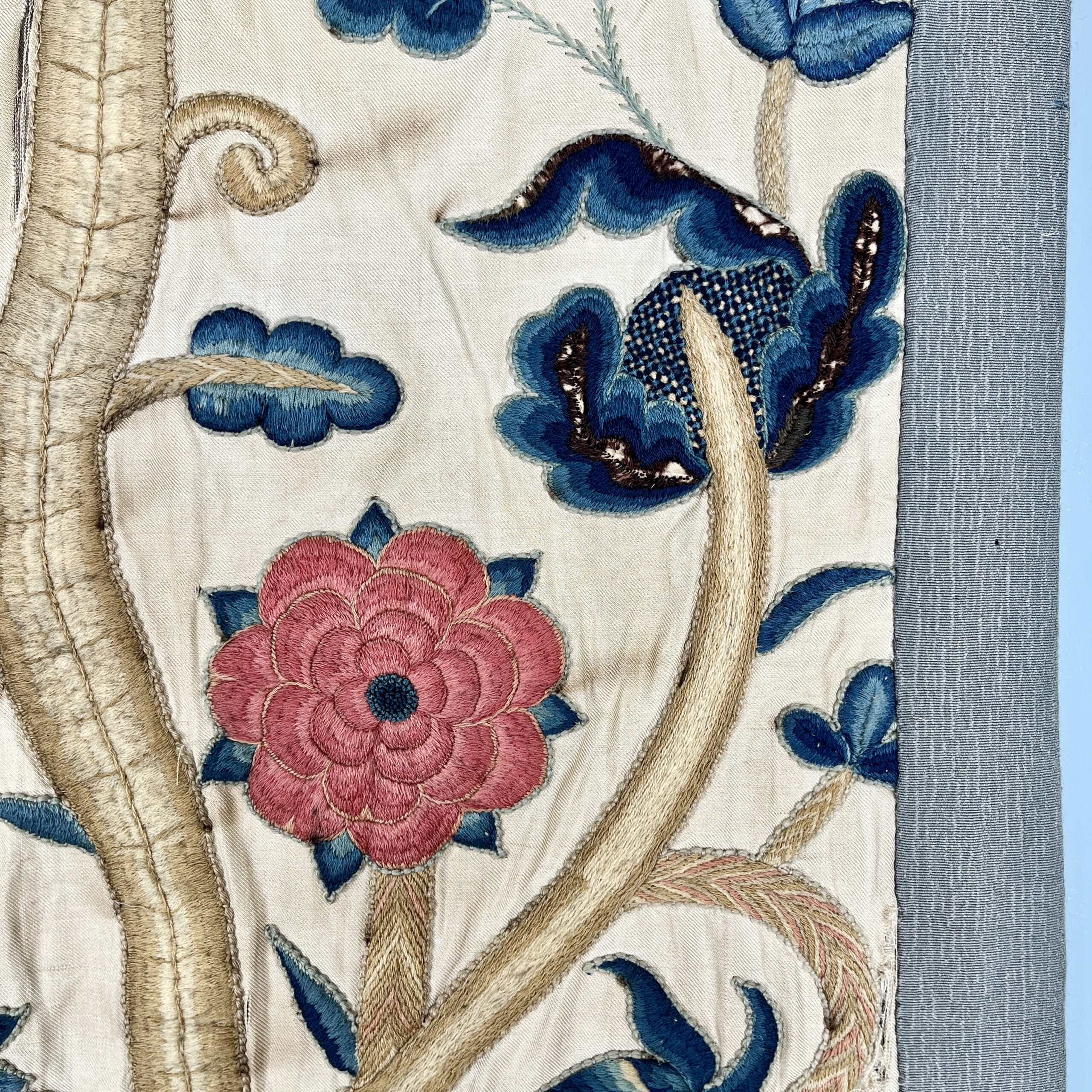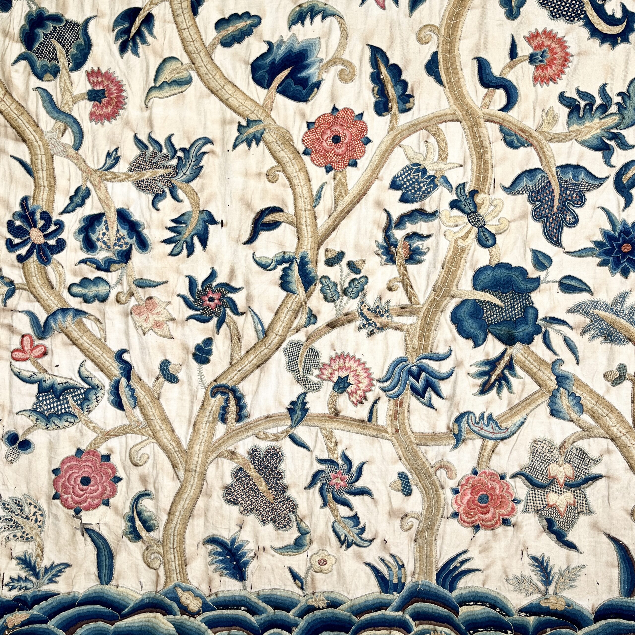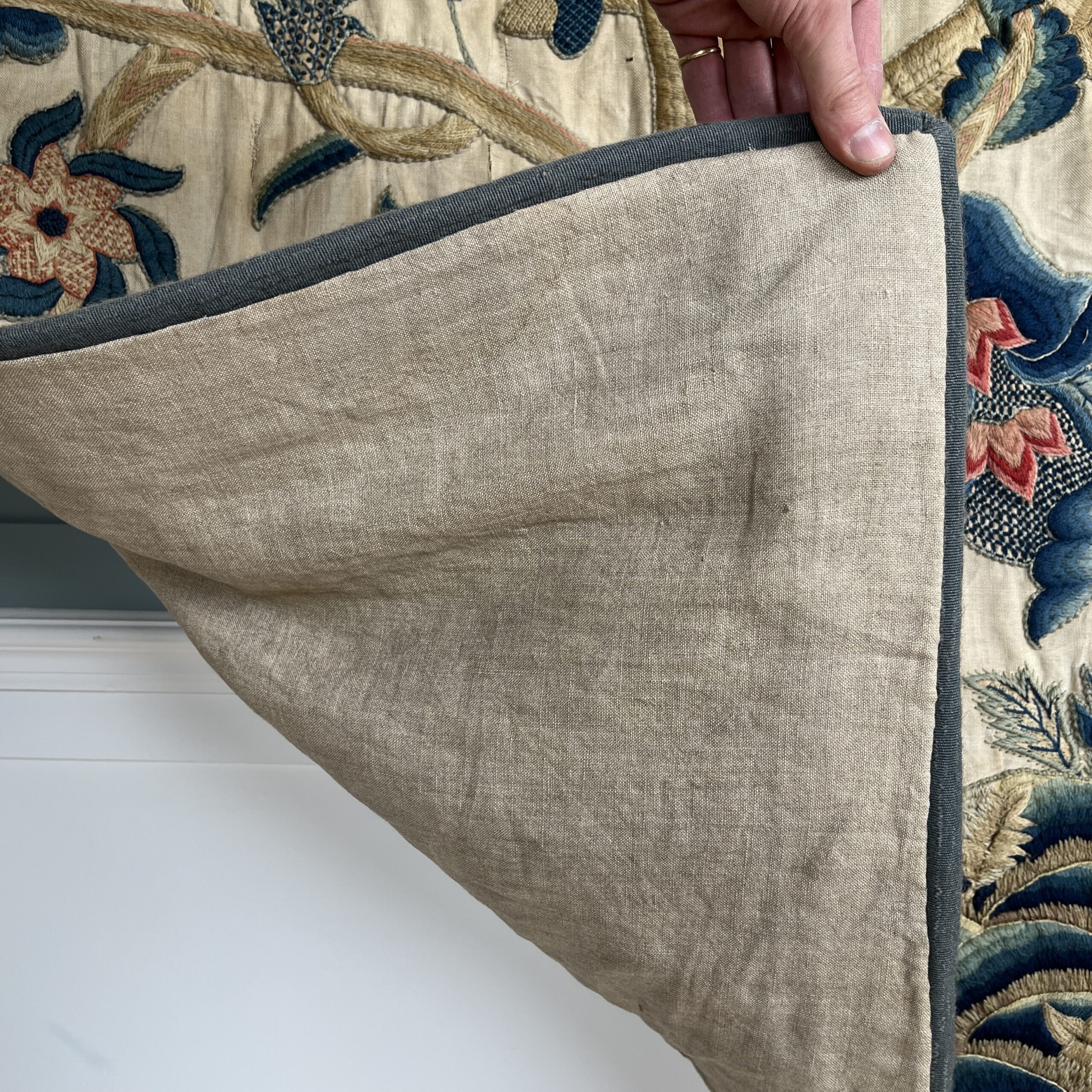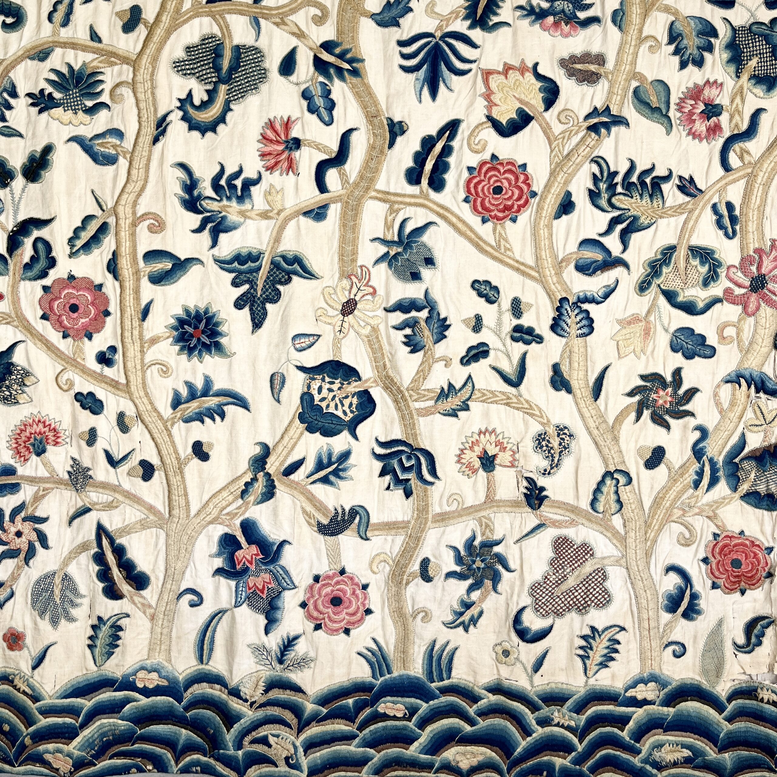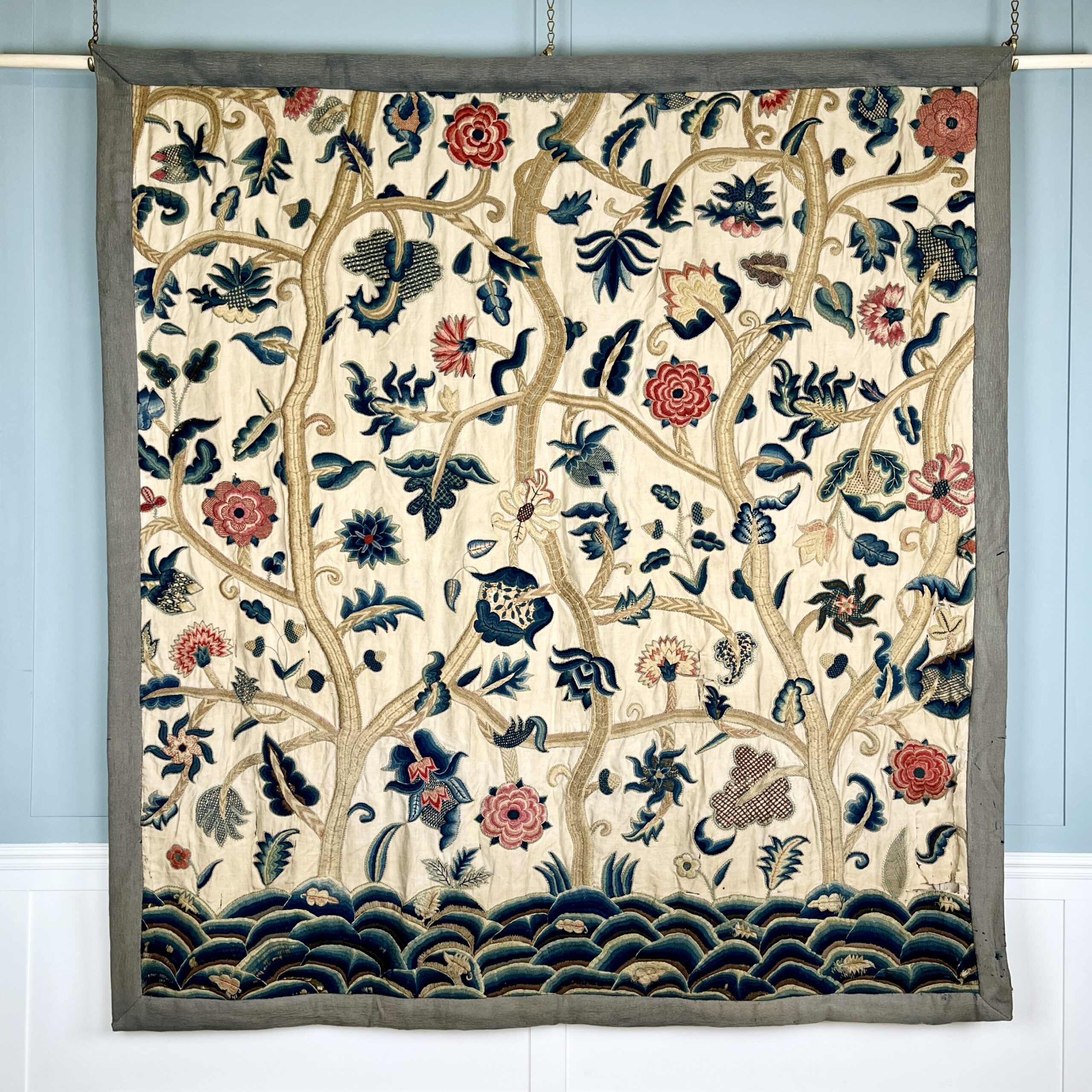 Such colourful woollen embroideries on linen grounds were popular for four poster beds and wall hangings from the late Elizabeth period & especially in the last half of the 17th century, the swirling & exotic tree of life designs were influenced by Hindu textiles brought to Europe by the pioneering East India Co., the designs were anglicised so you can see here acorn leaves & plentiful heraldic roses, the roses in the offered works are an uncommon feature and make a powerful statement of allegiance therefore, it’s intriguing to speculate on actual royal connections, the Tudor rose remained a symbol of monarchy, of union & of England throughout the 17th century, William & Mary adopted it as an emblem of their rule, it appears on decorative objects they commissioned such as delftware, items sometimes given as gifts to nobility & supporters. They could be used for a bed project but are also a great size to make a bold statement as wall hangings.