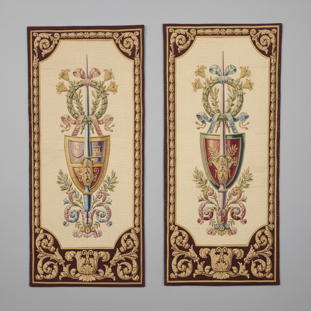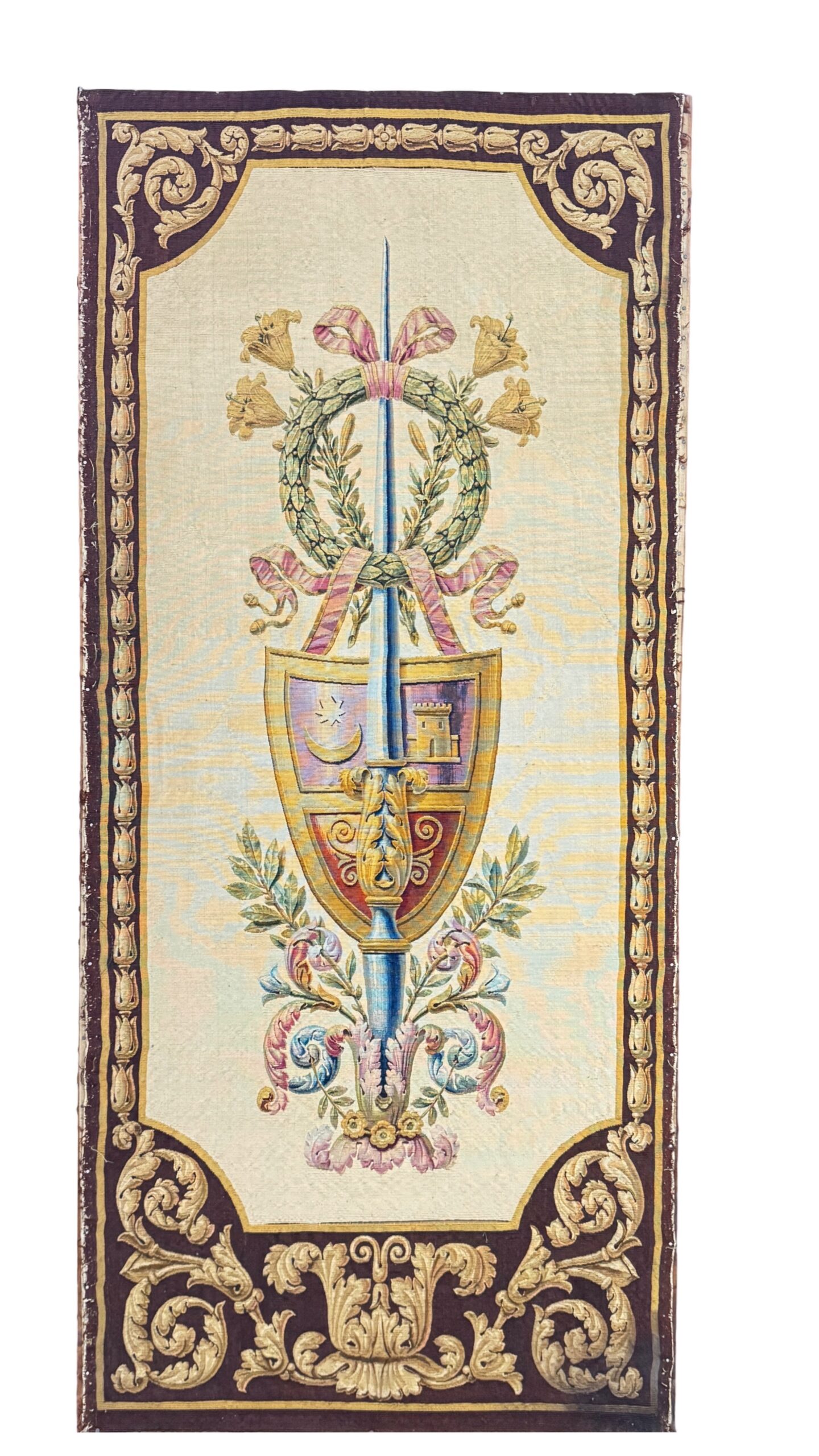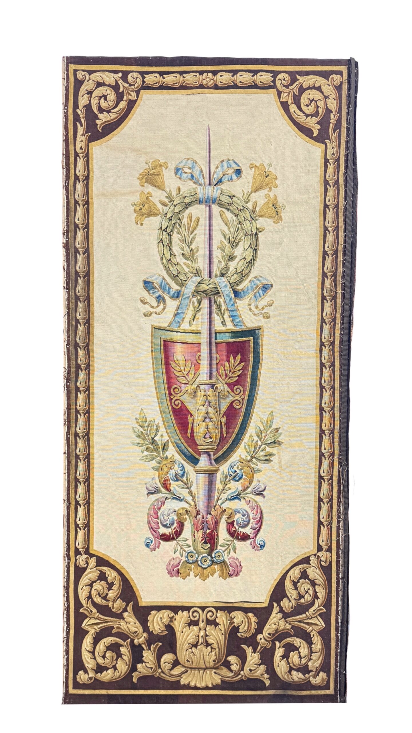Pair of tapestry wall panels, each worked in coloured wool with a design centred with an armorial shield suspended by ribbons from a laurel wreath, in turn hung from a lance, against a cream coloured ground within a baroque scrollwork border. Supported on wooden stretchers. Also available as a set of four, priced at £7300