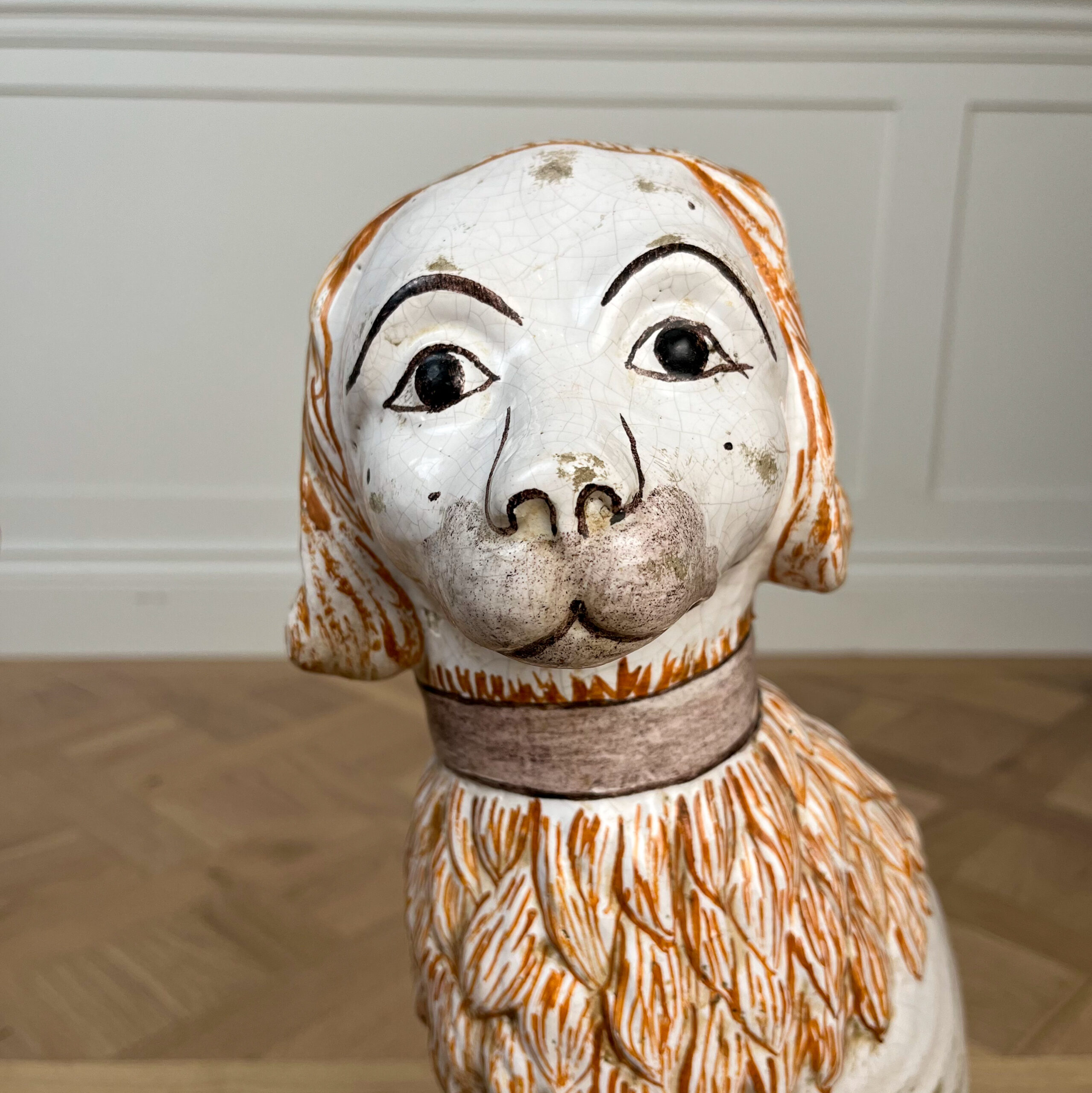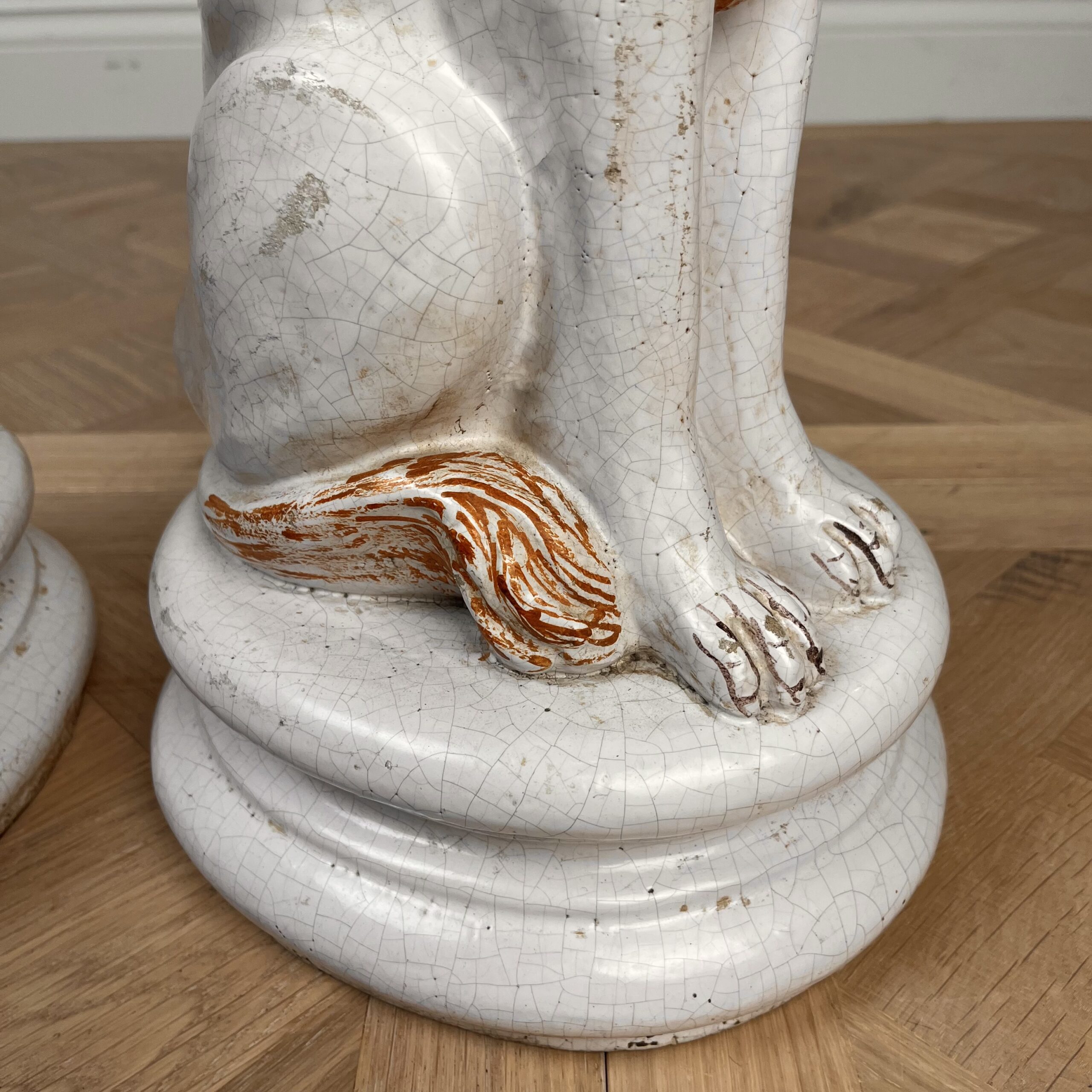A charming pair of Italian faience glazed pottery figures in the form of seated dogs wearing collars and raised on integral, waisted socles