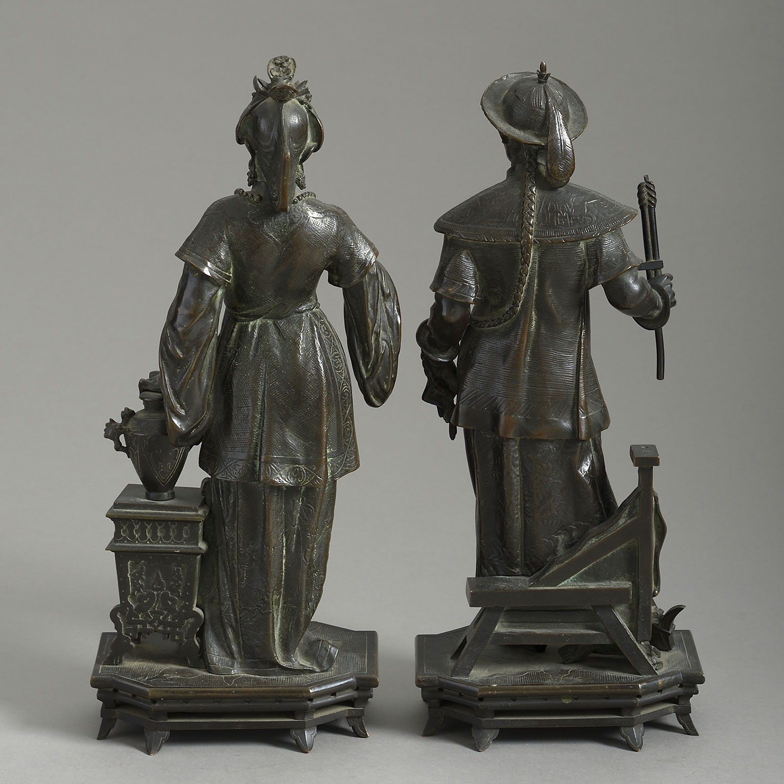 A fine pair of French chinoiserie bronze figures showing standing male and female figures in oriental dress and with attributes. Signed by François Willème (1830-1905)