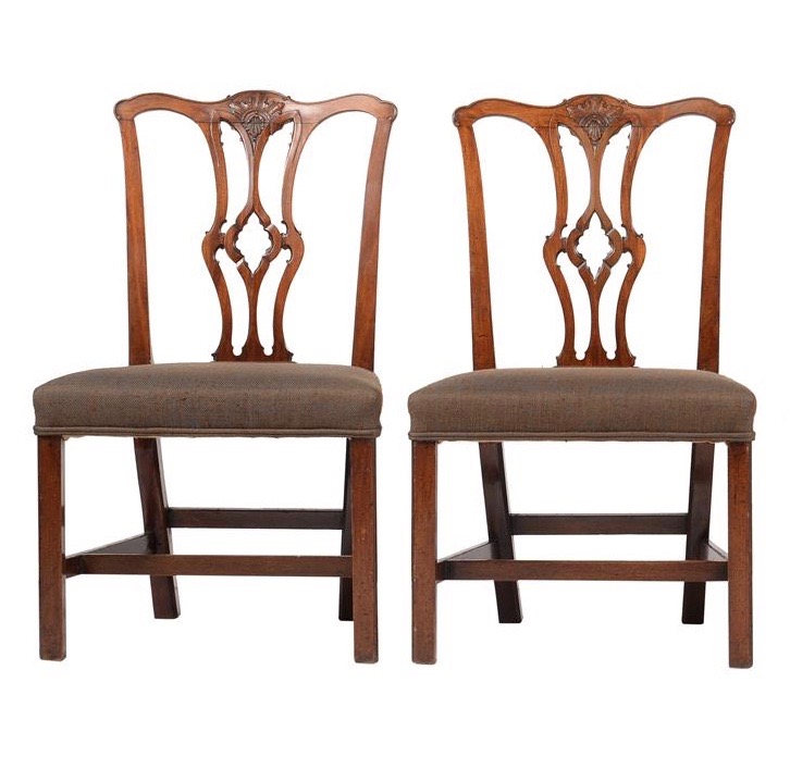 A pair of Georgian side chairs og generous scale, with shaped top-rails above pierced, leaf-carved ‘gothick’ tracery splats, the stuffed seats raised on chamfered legs joined by stretchers