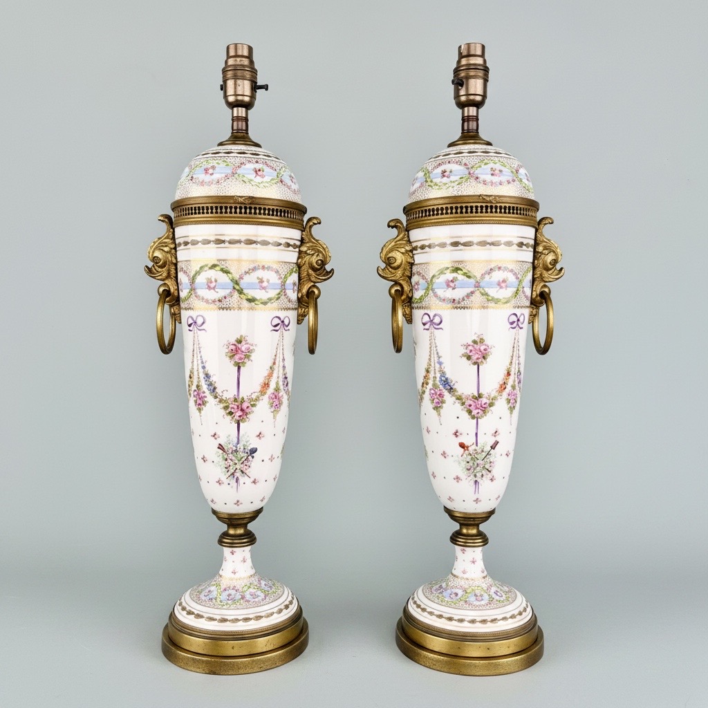 A pair of Paris Porcelain lamps in the form of attenuated vases decorated with swags of flowers in Sèvres style and with gilt-metal mounts including dolphin handles; with crossed L marks in. blue, in imitation of Sèvres, and a label for À LA RENAISSANCE, OBJETS D’ART.