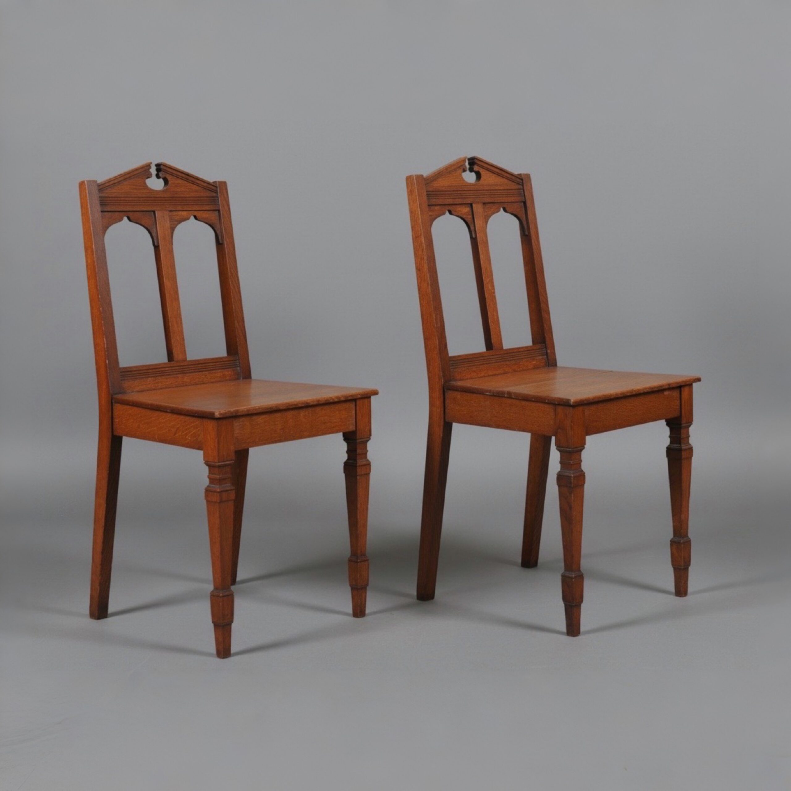 A pair of Victorian oak hall chairs, each with a cresting in the form of an architectural pediment above an open, arcaded back and solid boarded seat raised on square tapering legs. In the manner of James Shoolbred