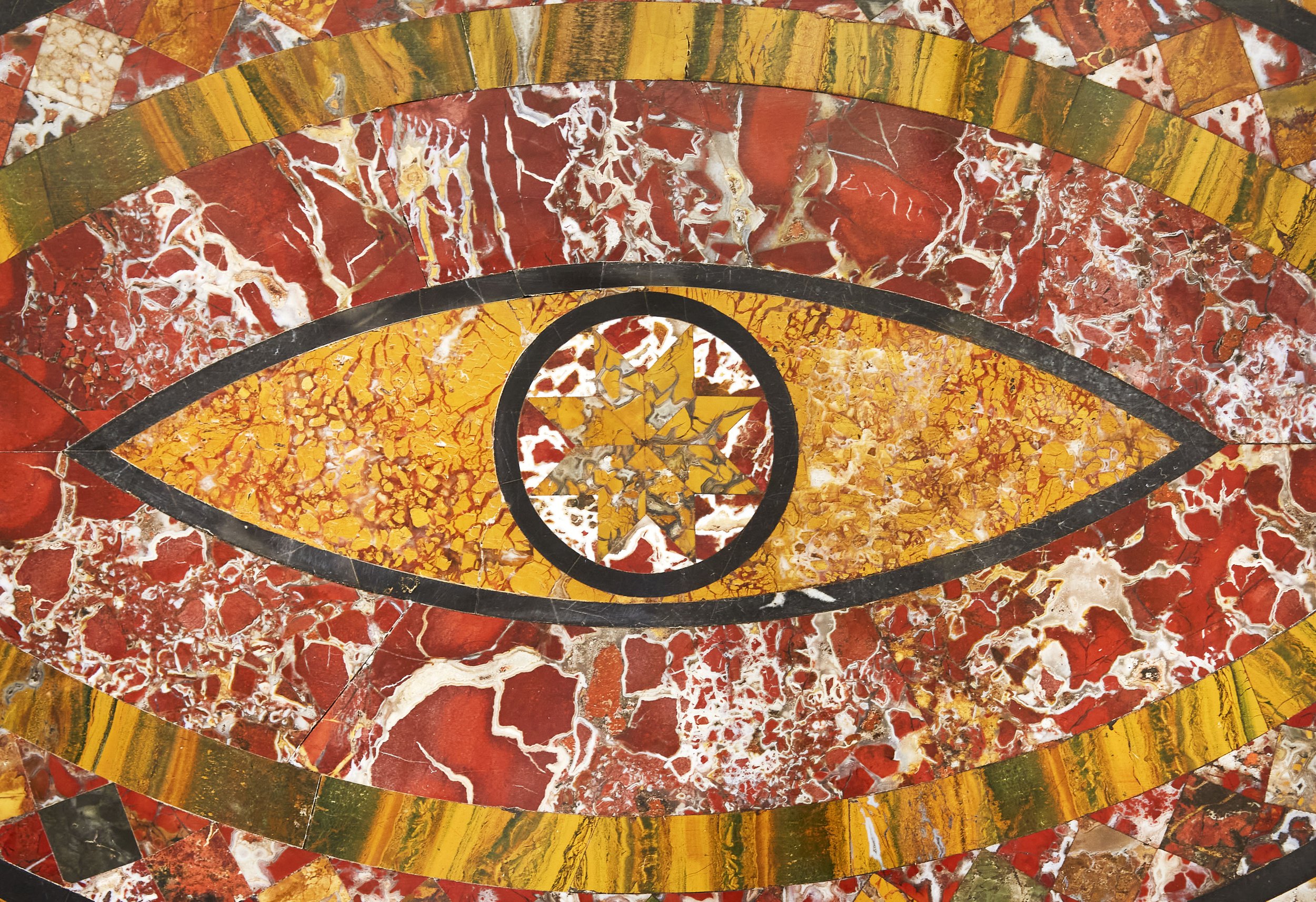 An exceptional Pietra Dura side table, the rectangular top with navette shaped design, perhaps representing the Occhio della Providenza or ‘All-Seeing Eye’, the pupil formed of a star, the surrounding eye filled with coloured stones, the spandrels also in an extraordinary marble, possibly a kind of Sicilian Jasper, all within an outer porphyry border, the mahogany table stand with a drawer in the frieze raised on fluted Doric columns at the front and fluted Doric pilasters at the rear flanking a mirror-glass panel, raised on a stepped plinth base