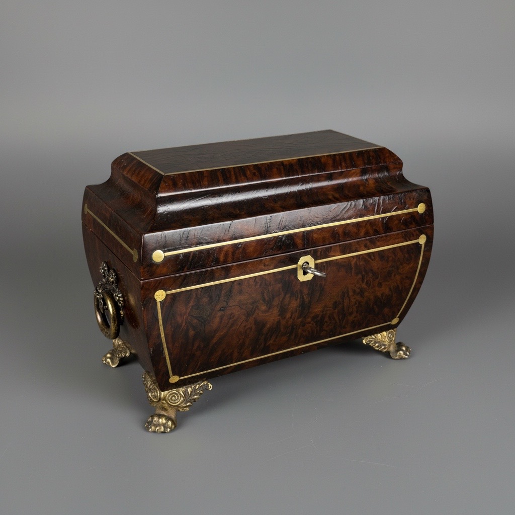A fine, well patinated Regency burr yew wood tea caddy of sarcophagus form inlaid with brass lines, with ring handles to the sides and standing on foliate clasped paw feet. The inside lined with original velvet to the lid and two removable covers to the metal-lined compartments.