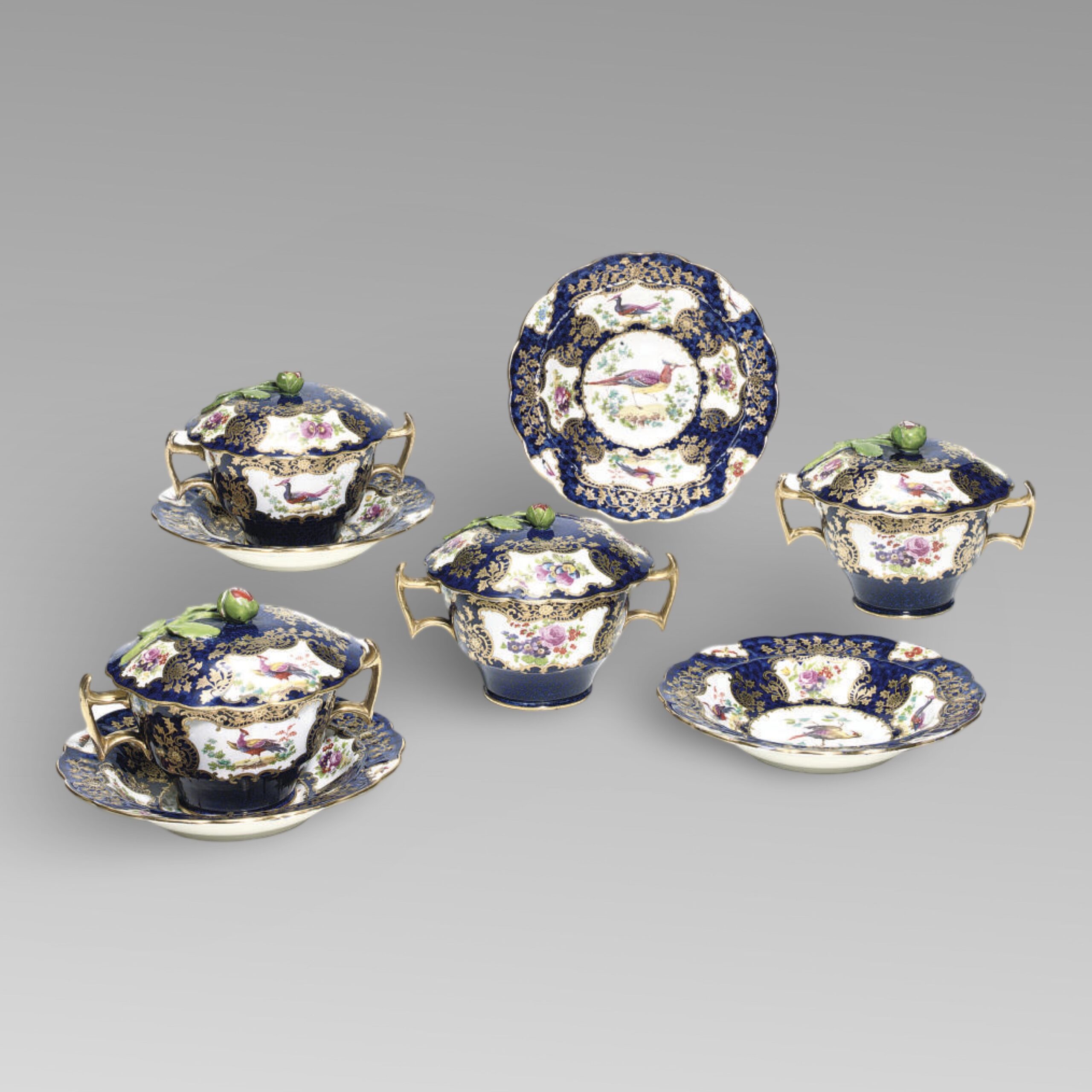 A set of four Worcester style cups, covers and stands. The cups decorated with exotic birds and bouquets within gilt scroll and flower cartouches on a blue-scale ground, the covers with green and red bud finials