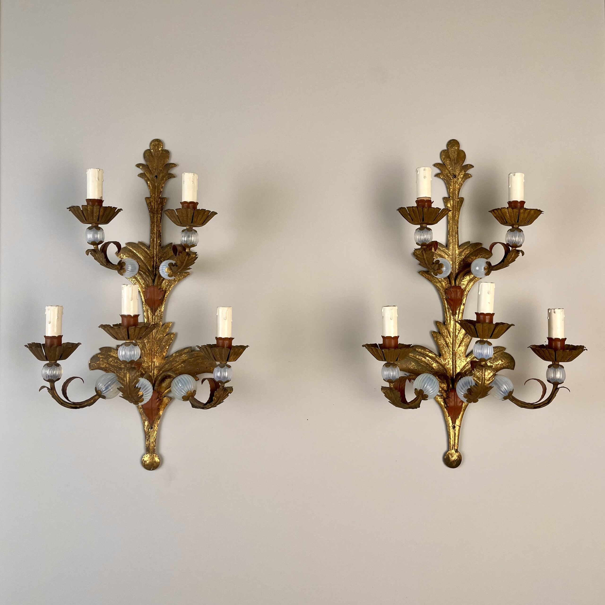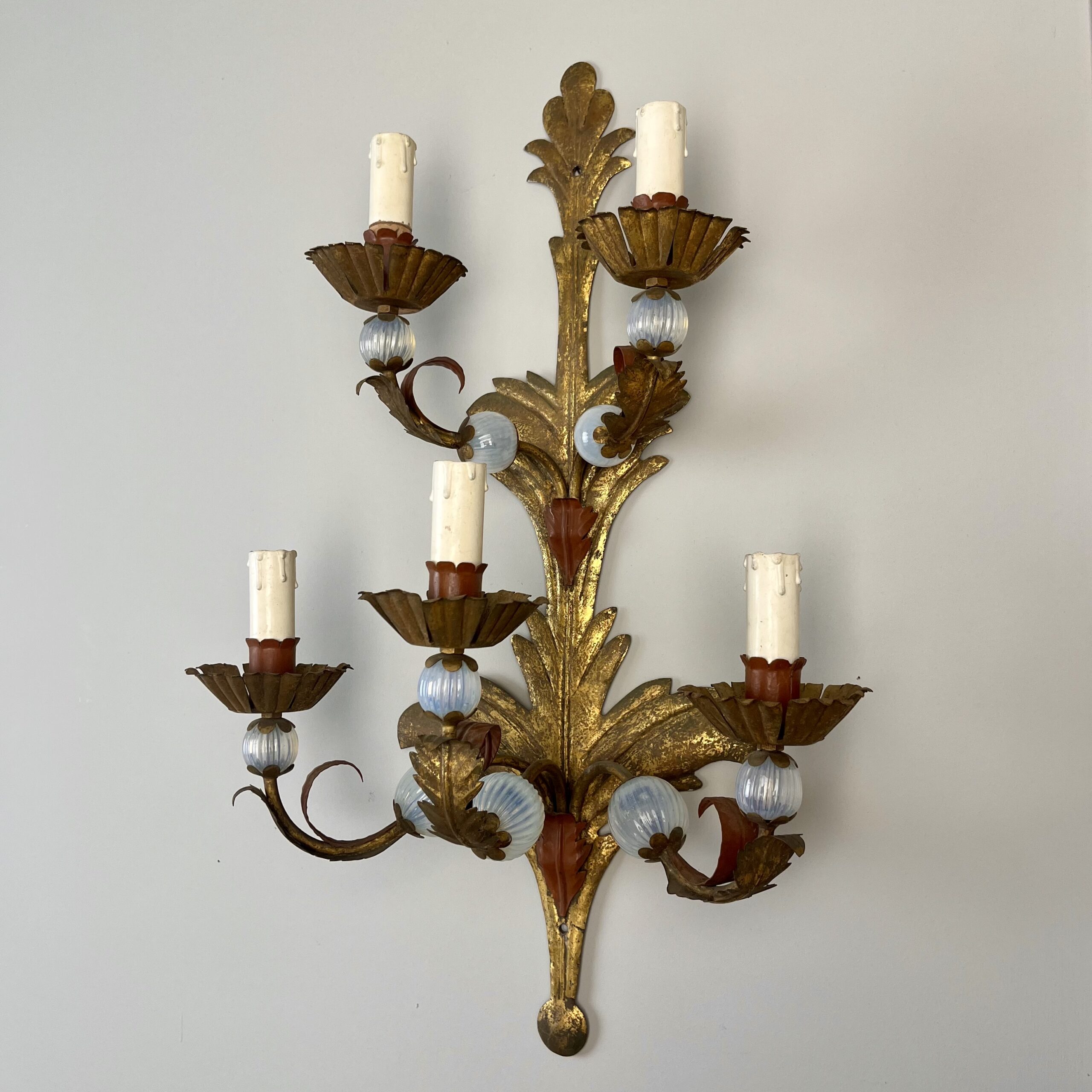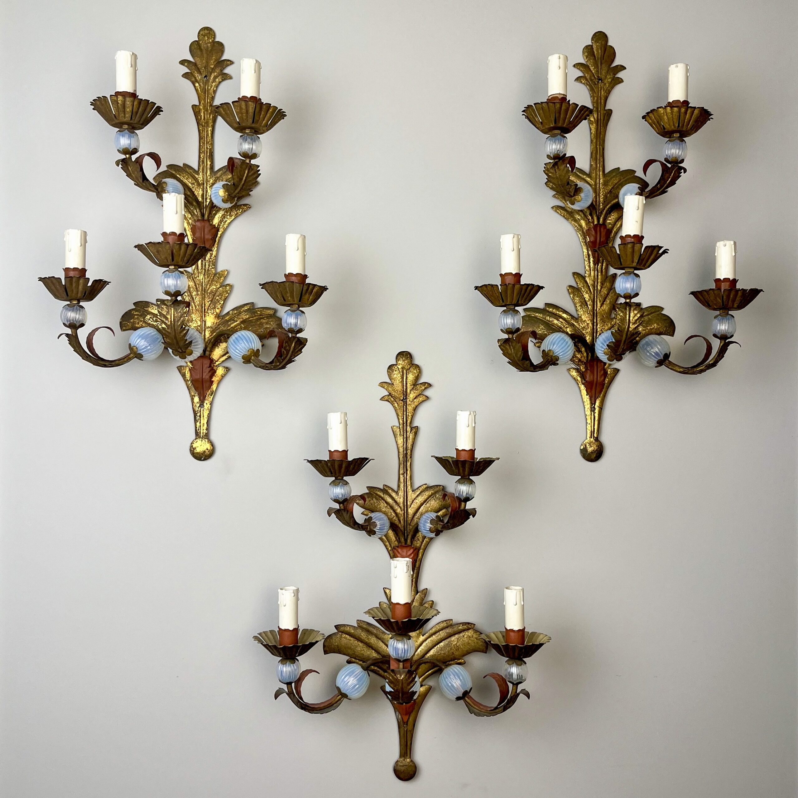 A stylish set of three large tole wall lights, each with foliate back plates with five scrolling branches mounted with Barovier style Murano glass spheres and toleware leaves decorated with gold leaf and oxide red. Also available as a pair and a single