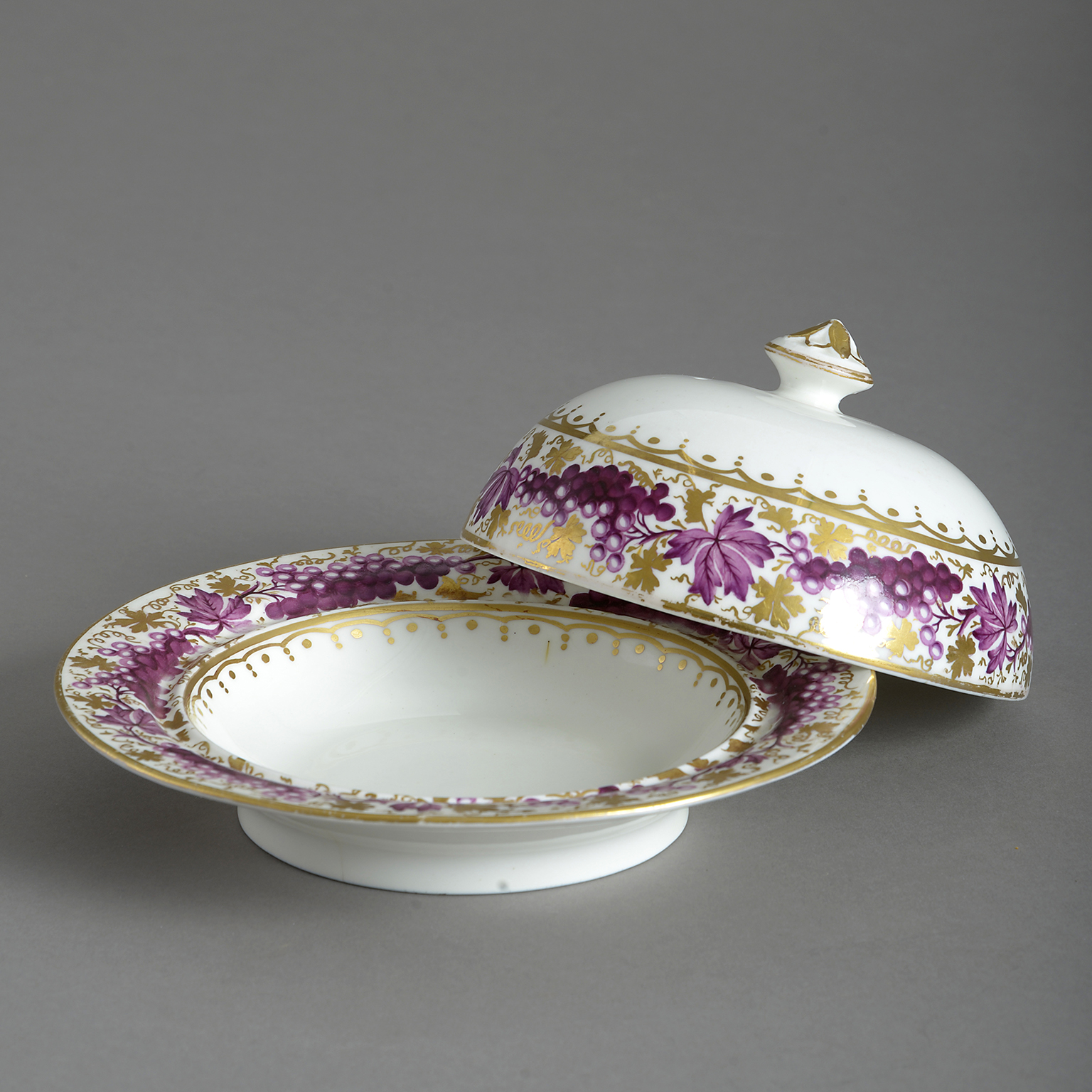 decorated with borders of trailing vines in magenta with gilt highlights. Retailed by Thomas Goode & Co. South Audley St, London