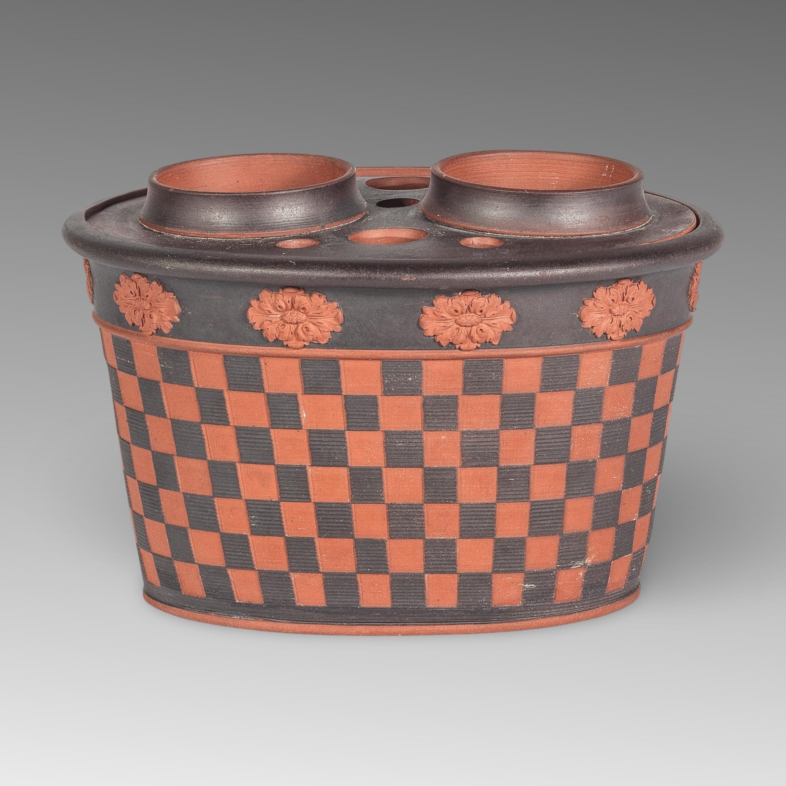 A rare Wedgwood diced ‘Rosso Antico’ bulb pot and cover, of tapering ovoid form, dipped in black basalt slip and engine-turned to the red body with a diced or chequerboard pattern below a border of paterae, the cover with two large, collared openings and seven smaller pierced apertures.