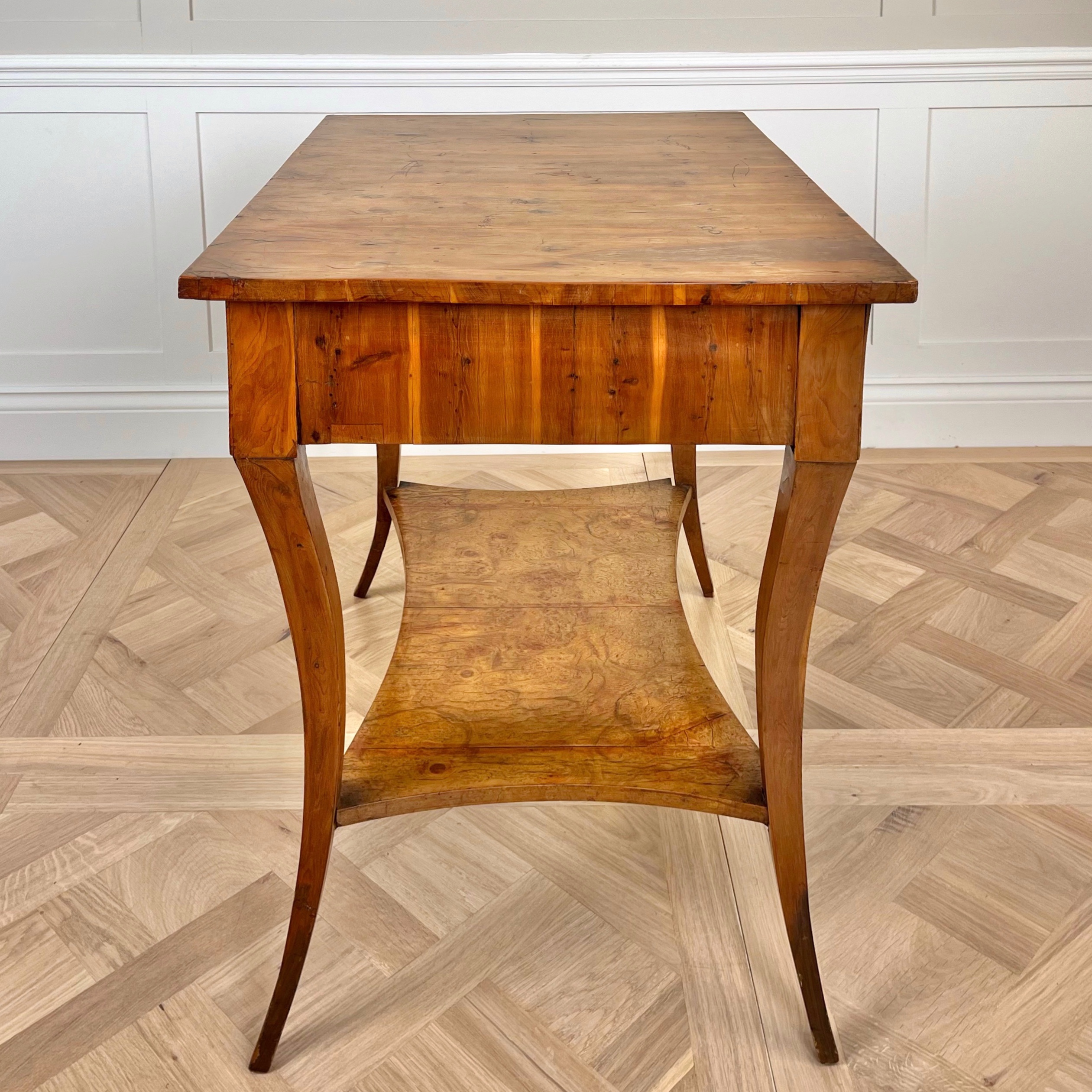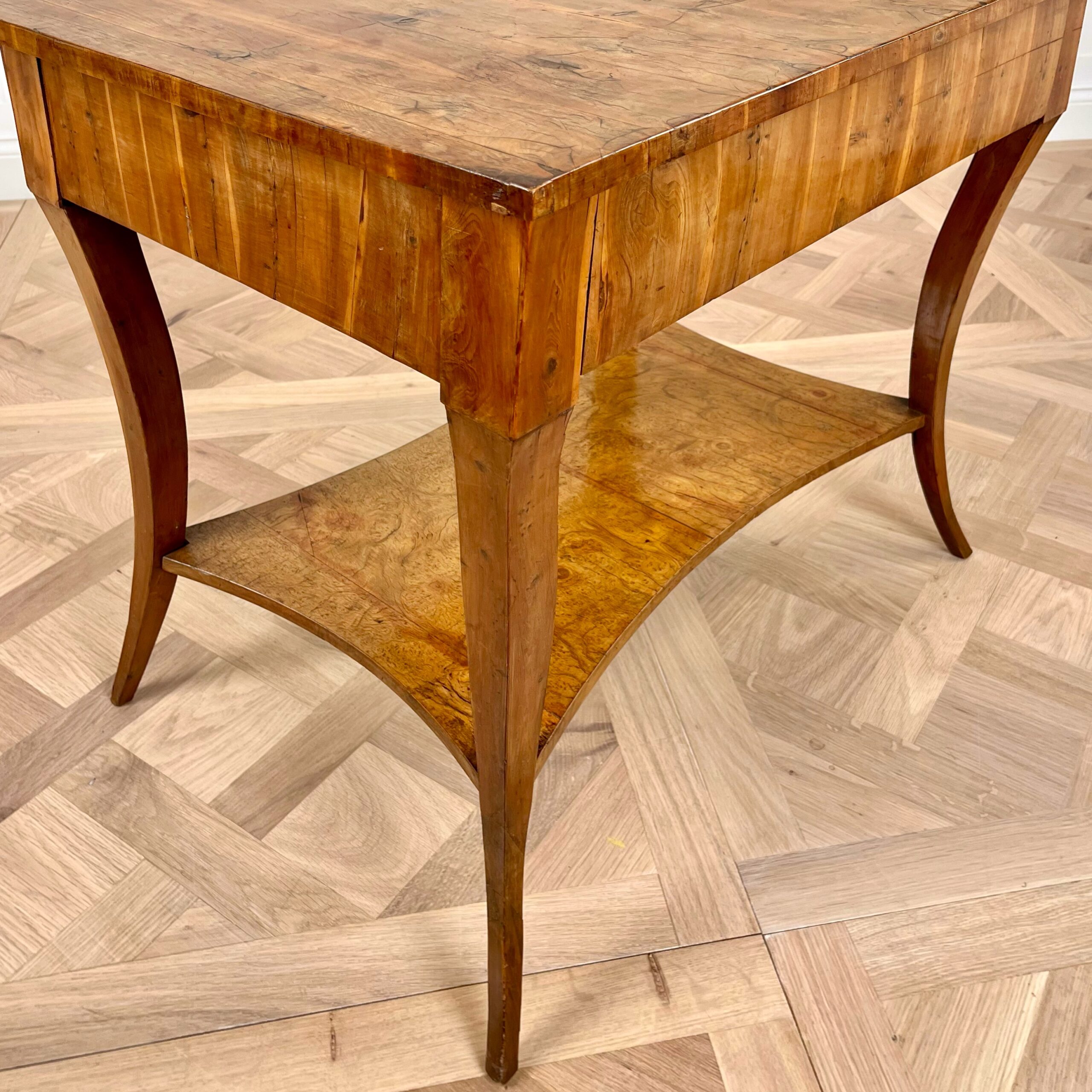 A stylish Yew-Wood centre table of pleasing colour, the rectangular top above a hidden, frieze drawer and raised on sabre legs joined by a concave-sided shelf stretcher. Veneered on all sides, allowing the table to be used as a centre table of side table